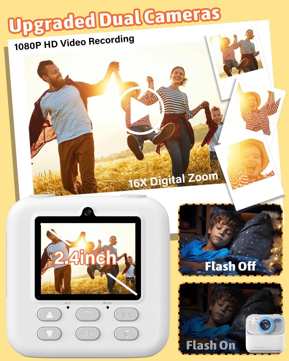 - Cámara digital multifuncional para niños: la cámara instantánea para niños tiene funciones enriquecidas, que incluyen impresión instantánea, captura de imágenes coloridas y videos HD 1080p, pantalla IPS de 2.4 pulgadas, zoom digital de 16x, 3 juegos de rompecabezas, flash, lapso de tiempo, disparo continuo, reproducción, reproductor de música, más de 20 marcos de filtro, etc. El diseño es compacto y liviano, y los botones son fáciles de operar, lo que facilita que los niños lo dominen.