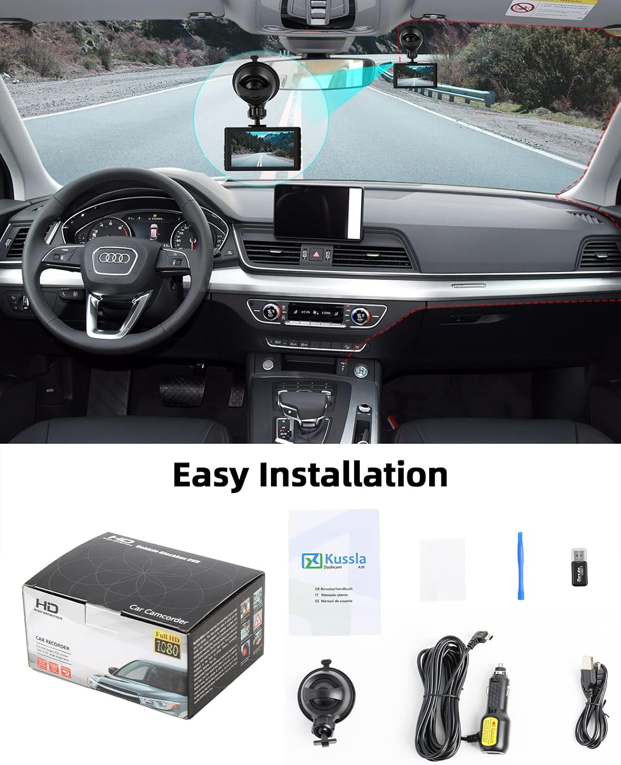 - Cámara de tablero LCD Full HD de 3 pulgadas 1920 x 1080P: sin aplicación, sin wifi, sin gps. Incluye tarjeta SD de 32 GB: la cámara de tablero de automóvil Kussla tiene efectos de video FHD de 1920 x 1080P 30 fps y campo de visión gran angular de 170°, que puede reducir eficazmente los puntos ciegos y grabar detalles claramente. Conecta el cargador del coche y la bobina de encendido para grabar directamente. El uso de la cámara de mando requiere conexión a una fuente de alimentación, y la batería integrada es solo para grabación de emergencia. Solo se puede utilizar durante 5 minutos sin energía)
