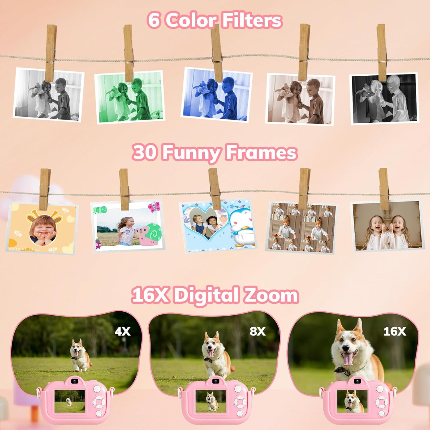 - Juguetes multifuncionales para cámara para niños para niñas de 3 a 12 años: la nueva cámara para niños tiene más funciones, incluyendo selfie, captura de fotos HD de 48 MP, grabación de video HD 1080P, reproducción, captura de lapso de tiempo, zoom digital 16X, juego y reproducción de música, etc. Además, hay 30 tipos de marcos de dibujos animados y 6 filtros de color que atraerán a los niños a descubrir más diversión. Y puedes subir las fotos o videos a tu computadora para mantener la preciosa infancia del niño