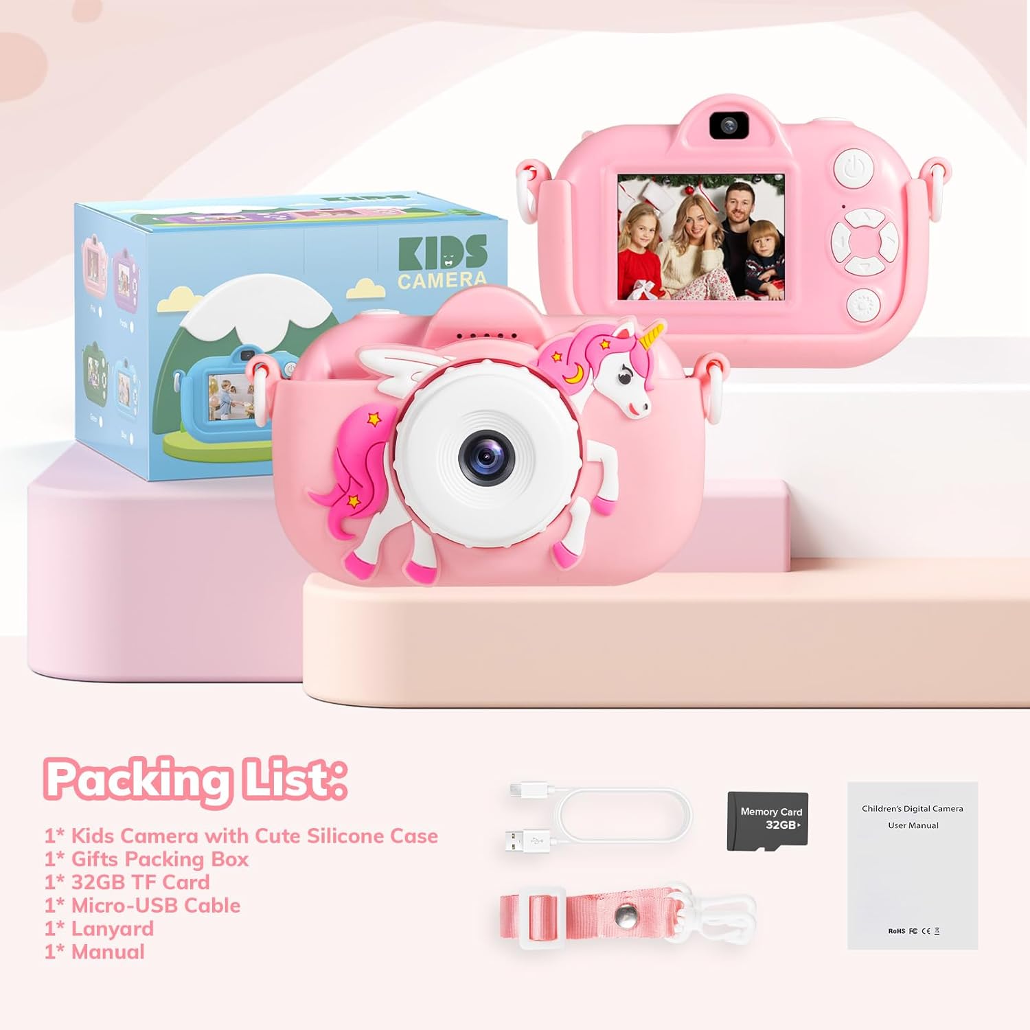 - Potente duración de la batería y gran tarjeta de memoria de 32 GB: la cámara digital para niños tiene una potente batería recargable integrada que es fácil y conveniente de cargar, la cámara de regalos para niñas puede tomar fotos o videos continuamente durante 1.5-2 horas después de la carga completa y se apagará automáticamente si no hay operación para preservar la duración de la batería. Preinstalada con una tarjeta TF de 32 GB que puede almacenar miles de fotos y videos, permitirá a los niños disparar en cualquier lugar en cualquier momento, nunca perderse ningún momento maravilloso.
