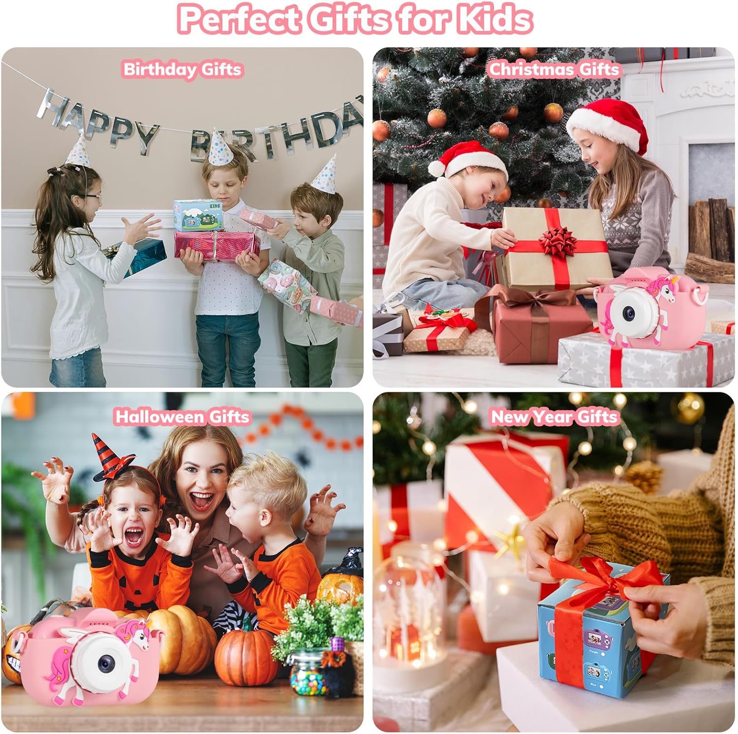 - visualización HD IPS de protección ocular y funda a prueba de golpes con cordón: nuestra cámara para niños tiene una visualización de protección ocular IPS frontal y trasera de 48 MP HD que puede evitar dañar la visión de tu hijo. Esta cámara de juguetes para niñas utiliza material ABS de alta calidad no tóxico de grado alimenticio que es más seguro. Con una carcasa de silicona a prueba de golpes, tus hijos no tienen que preocuparse por daños a la cámara, y el diseño compacto hace que sea fácil para los niños sostener la cámara en las manos. También con un cordón, el niño puede colgar la cámara del niño en su cuello
