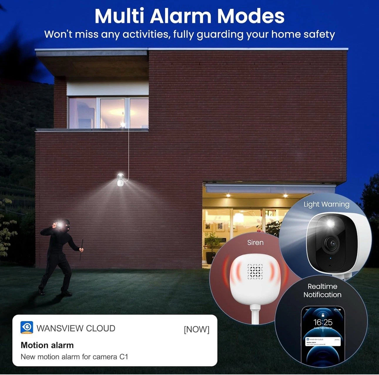 Conversación bidireccional y detección de movimiento: La cámara de seguridad exterior está equipada con un micrófono y un altavoz con cancelación de ruido. Puede hablar a distancia con familiares, mascotas o visitantes inesperados a través de la cámara Wi-Fi a través de la aplicación del teléfono. Las cámaras domésticas con audio y video le brindarán una experiencia de usuario inesperada. Al detectar movimiento, la cámara interior le enviará una notificación a través de la aplicación del teléfono. Si alguien entra en casa, la sirena integrada le ayudará a disuadir a los intrusos.