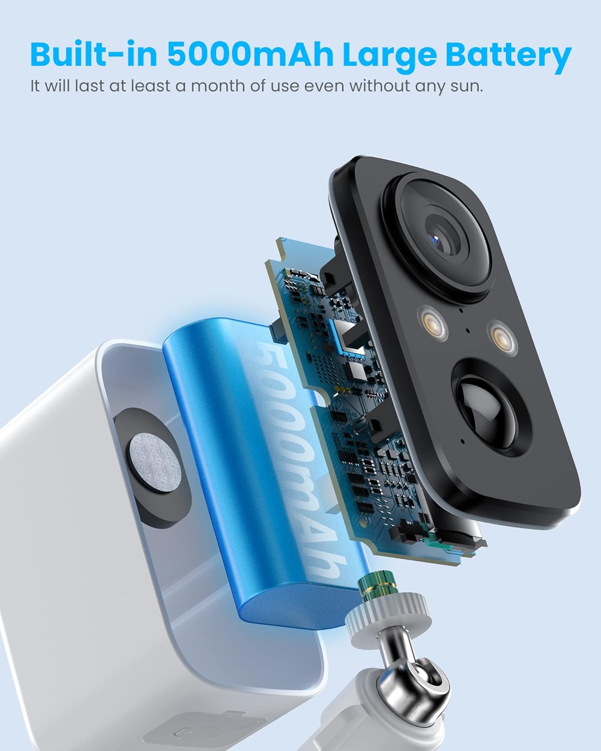 - Batería inalámbrica con energía solar: nuestras cámaras solares para seguridad en el hogar eliminan la necesidad de cables, por lo que es fácil de instalar y usar. Esta cámara de batería recargable inalámbrica puede funcionar continuamente mientras haya luz solar para proporcionar la energía eléctrica necesaria. Disfrute de una seguridad ininterrumpida en el hogar con nuestras cámaras de seguridad de vigilancia.