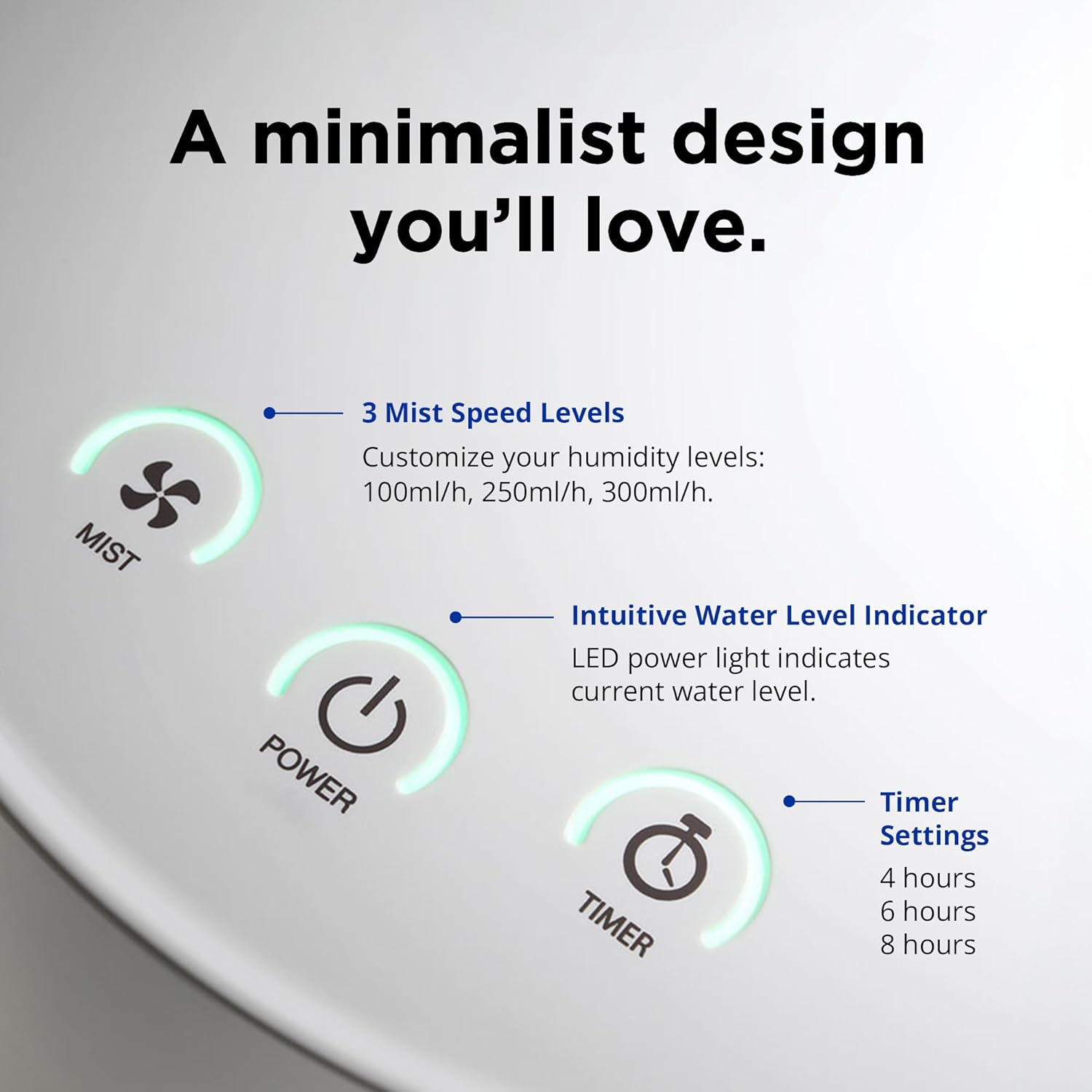 - Hidratación de larga duración y niebla ajustable: con un tanque de 4 litros, este pequeño humidificador para dormitorio y sala de estar proporciona hasta 30 horas de niebla continua en el nivel 1 y 10 horas en el nivel 3 para satisfacer las necesidades de hidratación de tu habitación.