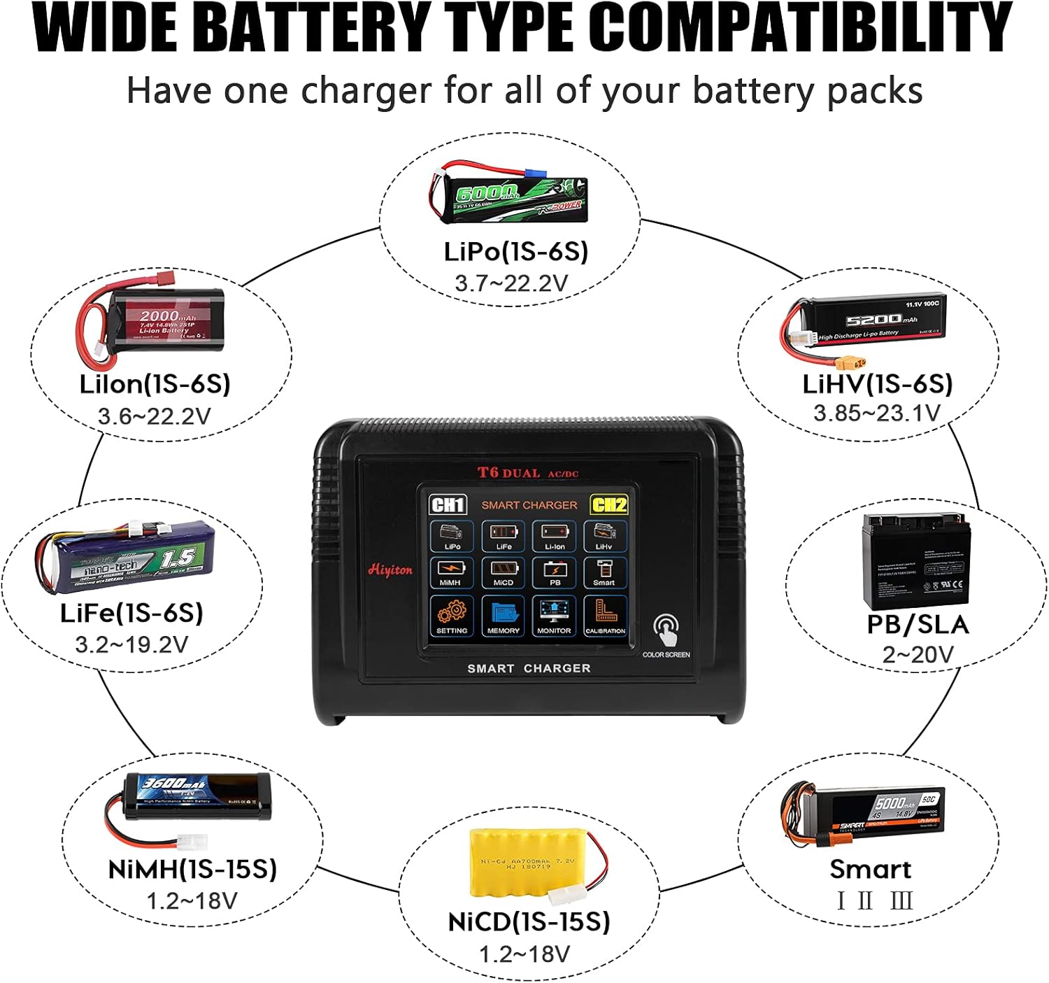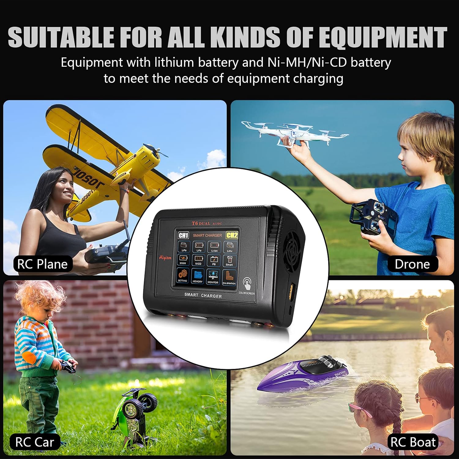 - Cargador doble Lipo - El cargador de batería lipo dual con el modelo de entrada dual AC/DC, el cargador 2 en 1 de dos canales puede cargar dos tipos diferentes de baterías simultáneamente con diferentes voltajes. No utilices el cable de alimentación de CA y el cable de CC al mismo tiempo.