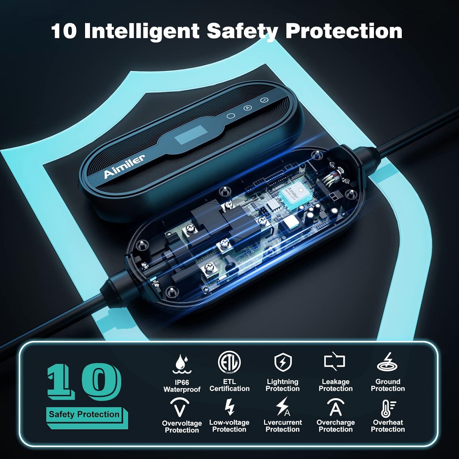 - Grado de protección Nema tipo 4 y cable grueso de 16 pies]: Aprobado por NEMA Tipo 4, el cargador Aimiler ev se puede utilizar en interiores o exteriores en cualquier tipo de clima, incluyendo nieve, lluvia, granizo, etc. Protección resistente al fuego, sobrecorriente, sobretensión y sobretemperatura. Equipado con cable de carga de grado militar de 25 pies, el enchufe resistente a caídas soporta más de 10,000 cargas, hasta 2 toneladas de presión, y ofrece una vida útil de 20 años.