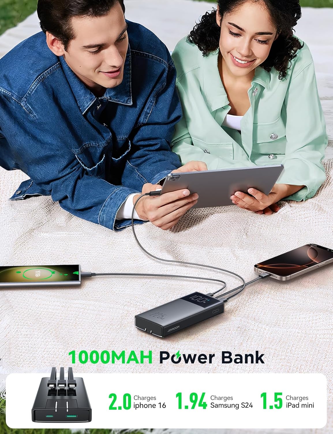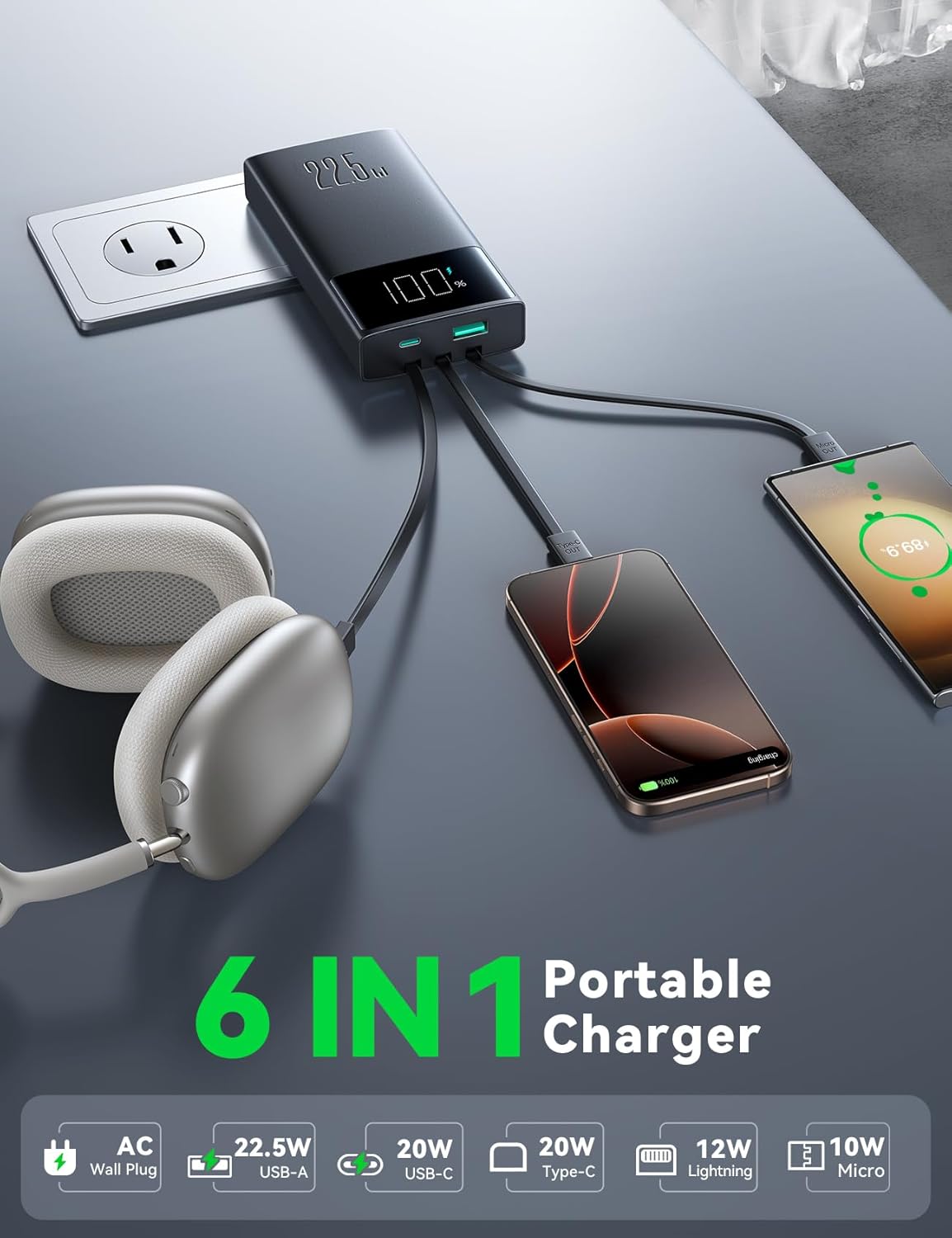 - Cargador portátil 6 en 1: el cargador portátil JOYROOM de 10000 mAh tiene un enchufe de pared y 3 cables integrados (iOS, tipo C, Micro), puerto USB A y USB C, resuelve todos los problemas de carga del dispositivo a la vez