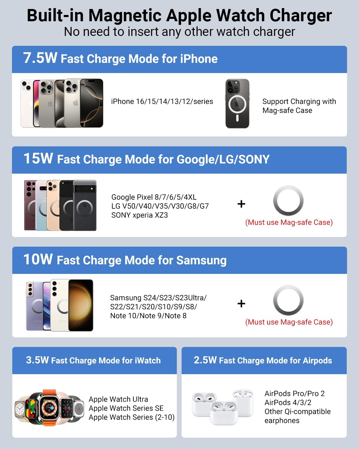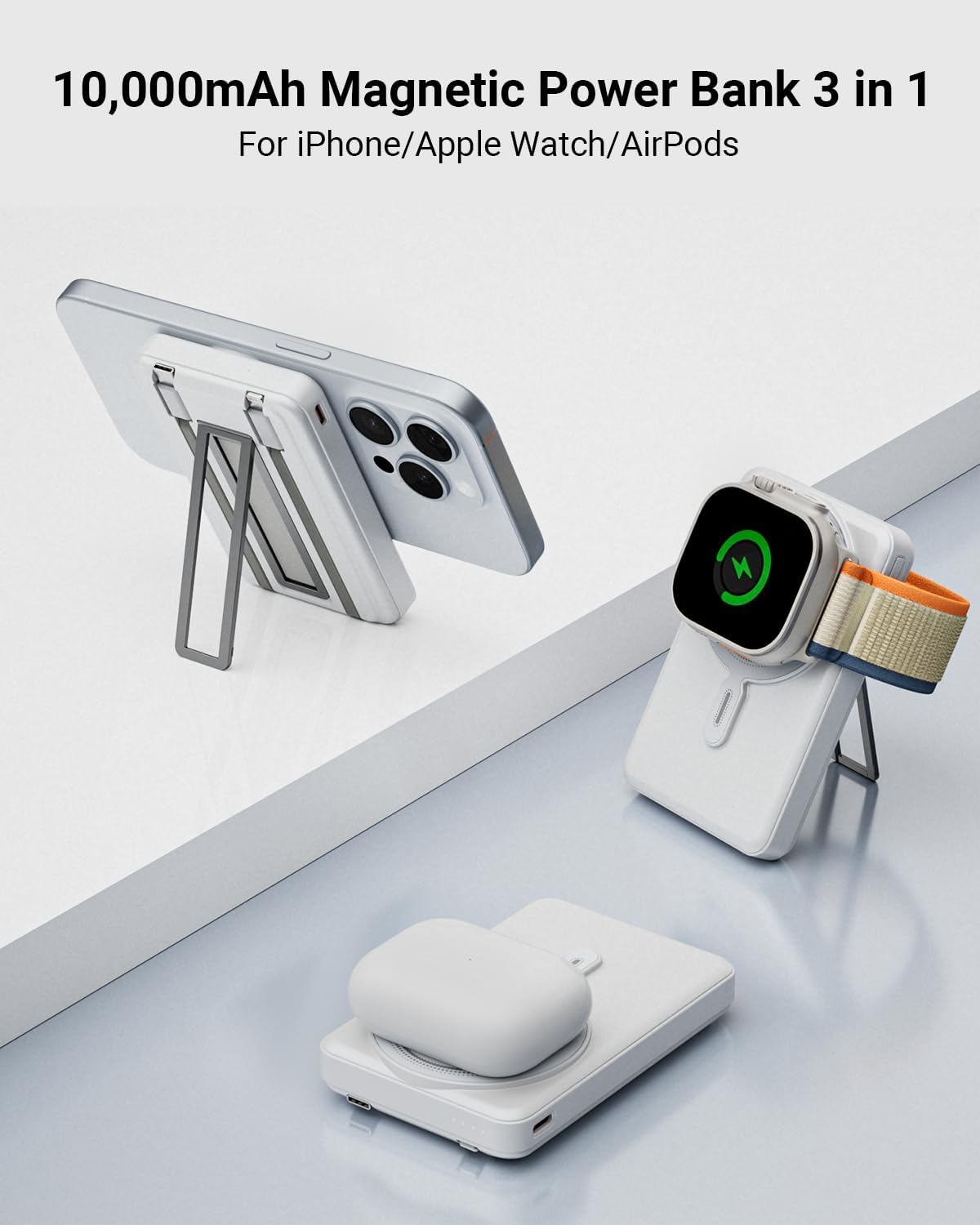 - Cargador portátil Apple Magsafe 5 en 1: Carga inalámbrica, esta batería externa inalámbrica permite cargar tu iPhone, Apple Watch y AirPods. Carga por cable, permite cargar dos teléfonos simultáneamente con dos cables integrados. Batería MagSafe perfecta para iPhone 16/16 Plus/16 Pro/16 Pro Max/15/14/13/12, Samsung Galaxy S24 Ultra/S23+/S23/S22 y otros teléfonos Qi. Excelente cargador para iWatch: Apple Watch Ultra 2/Ultra/10/9/8/7/6/5/4/3/2/SE, AirPods Pro/4/3/2.