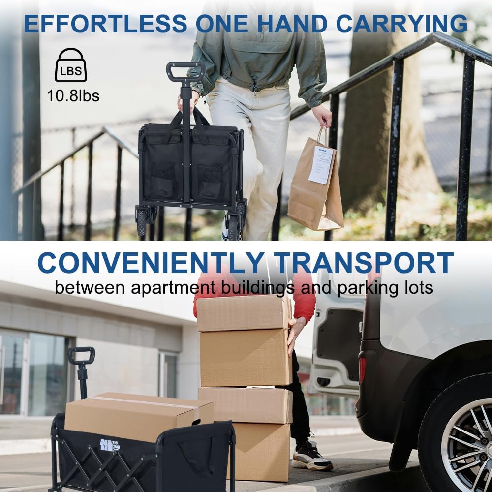- Sin esfuerzo: el carro plegable es de solo 10 libras, 50% más ligero que otros vagones. Manija de tracción integrada, fácil de instalar o plegar el carro en cuestión de segundos, adecuado para mujeres y ancianos para llevar y usar cómodamente.