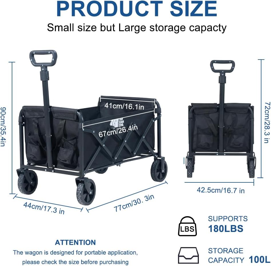 - Tamaño grande: nuestro carro plegable plegable desplegado: 35.4 x 30.4 x 16.1 pulgadas. Con capacidad de almacenamiento de 128 litros, es pequeño pero perfecto para mover cosas de tu coche al departamento y para comestibles.