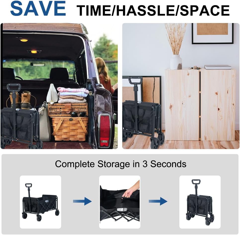 - Diseño extraíble y compacto: el carro plegable se puede plegar y poner fácilmente en tu maletero o asiento trasero. Retira las ruedas y el mango, y obtendrás un carro compacto que no ocupará demasiado espacio.