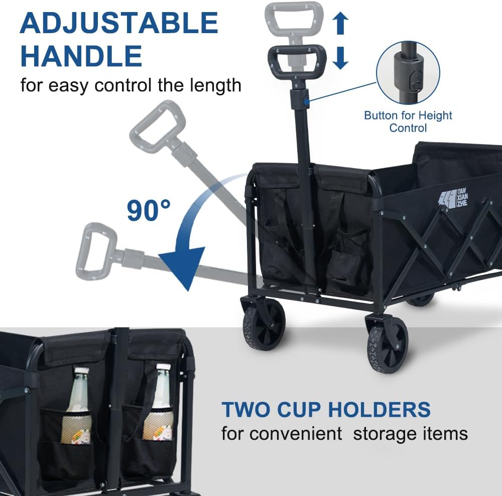- Ruedas suaves y mango ajustable: nuestro carro de utilidad está equipado con dos ruedas delanteras lisas giratorias de 360° y la longitud del mango del carrito de jardín plegable se puede extender de 28.3 a 35.4 pulgadas, ambos detalles te proporcionan una mejor experiencia para cualquier lugar en cualquier momento.