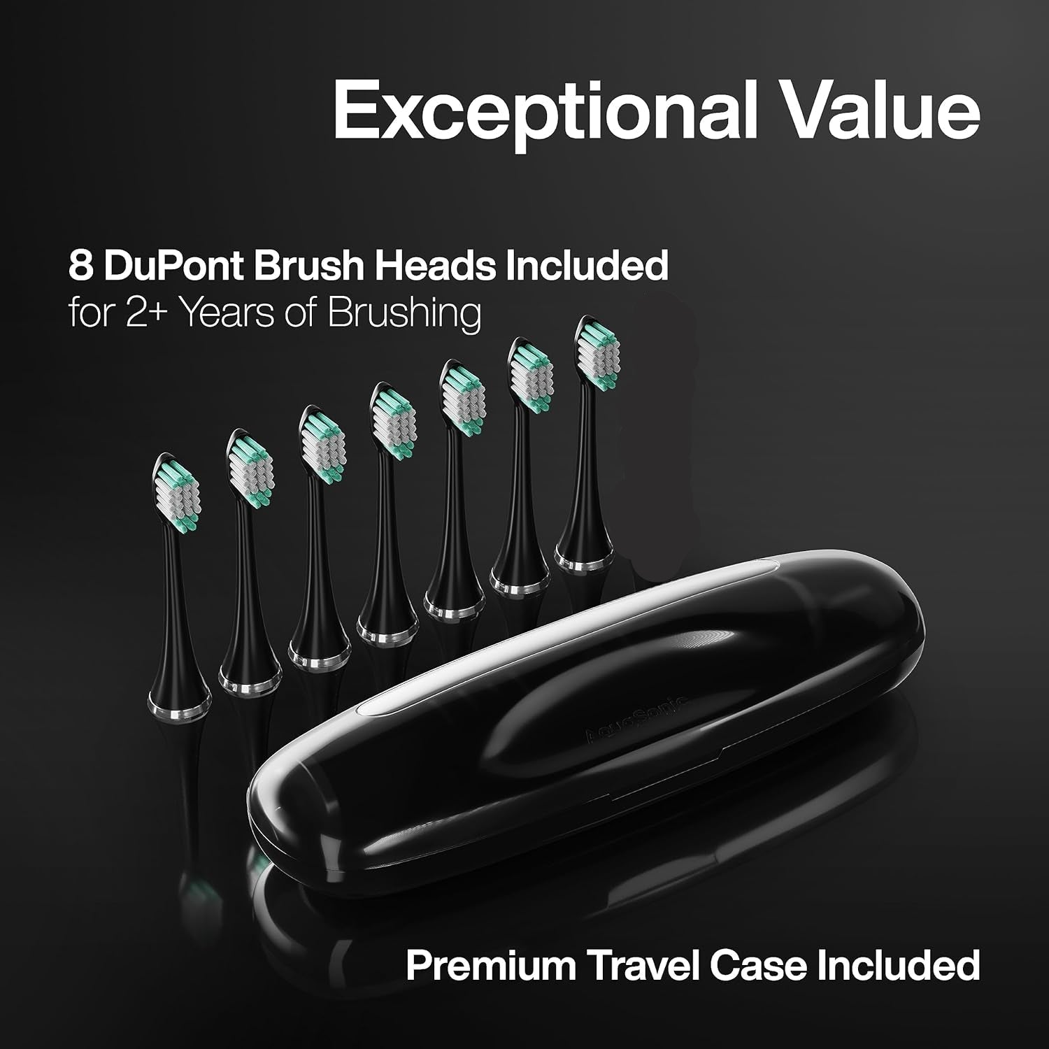 - 7 cabezales de cepillo DuPont y estuche de viaje incluidos: cada cepillo de dientes Black Series viene con 7 cabezales de cepillo diseñados por DuPont, un líder mundial en calidad y ciencia de materiales. Cada cabezal de cepillo dura 4 meses, por lo que 7 durarán más de 2 años. Tbién se incluye una práctica funda de viaje hecha de plástico libre de BPA con espacio para dos cabezales de cepillo. AquaSonic puede durar 4 semanas completas (2 min/2 veces al día) con una carga completa, por lo que es perfecto para viajes en movimiento con la funda de viaje incluida