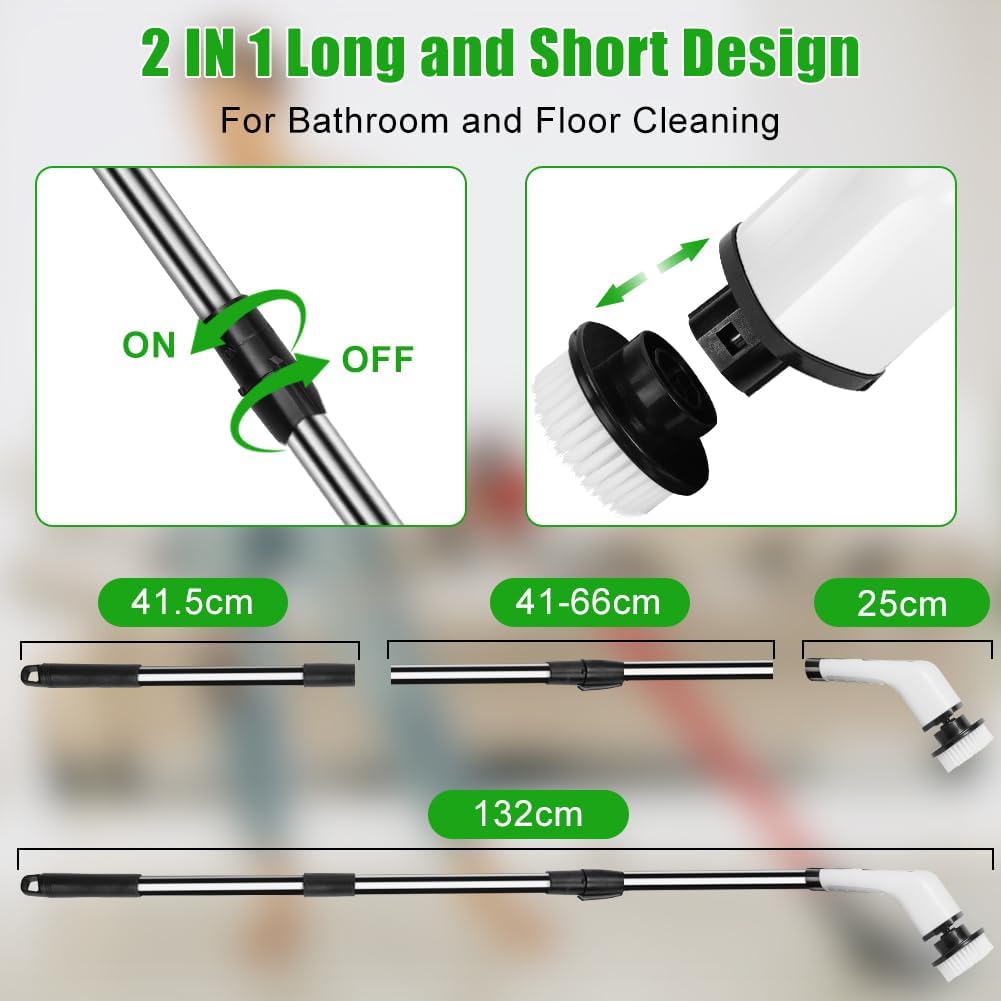 - Longitud ajustable y portátil. El Cepillo Eléctrico Limpieza de Baño Inalámbrico de 180 Grados para baño viene con un mango desmontable que se puede ajustar desde una cómoda distancia de 39,4 pulgadas a 44,1 pulgadas,puedes limpiar todo sin esfuerzo, desde la bañera hasta el techo sin necesidad de agacharte.Es perfecto para personas mayores o cualquier persona que sufra dolor de espalda. La varilla desmontable transforma el cepillo para pisos en una cómoda fregadora eléctrica de mano de 6,3 pulgadas en un instante.¡Es como tener dos potentes cepillos de limpieza en uno!