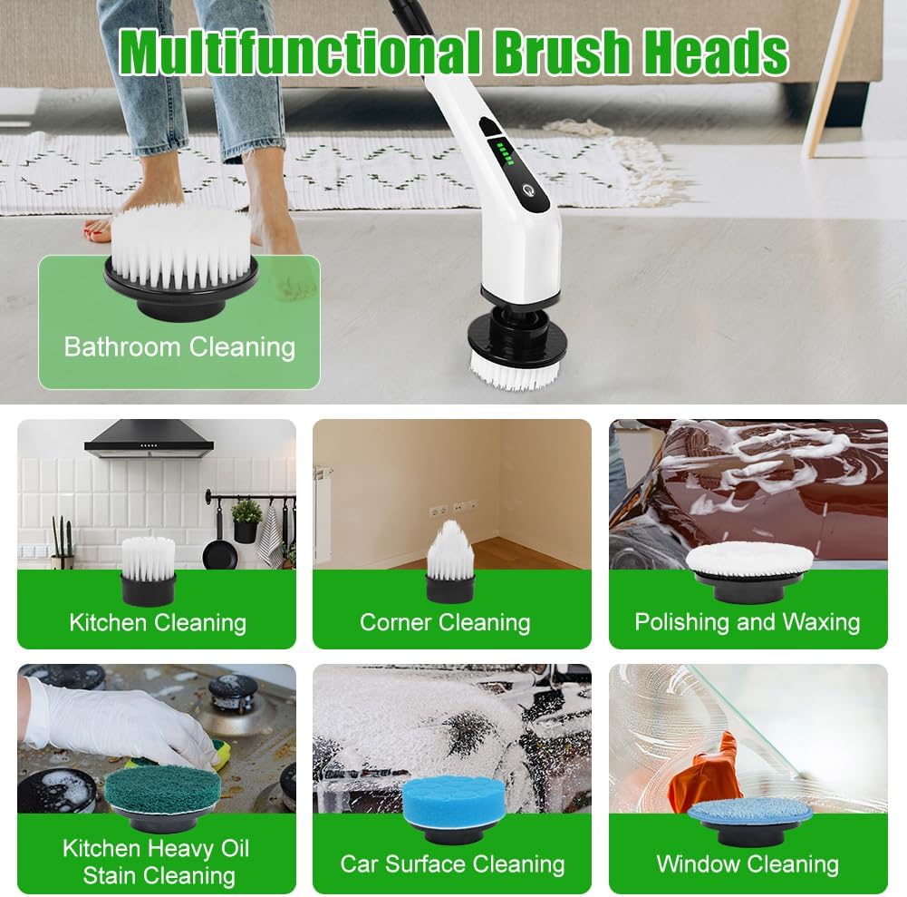 - 9 cabezales de cepillo multifuncionales. El Estropajo Eléctrico Giratorio ofrece 9 cabezales de cepillo reemplazables versátiles, adecuados para diferentes escenarios.Por ejemplo,limpiar áreas cóncavas como bañeras y lavabos,limpiar áreas estrechas y de difícil acceso como esquinas y huecos,así como limpiar suelos,vidrio,paredes de azulejos,superficies de automóviles,cubos de ruedas,asientos de automóviles,muebles y estufas.
