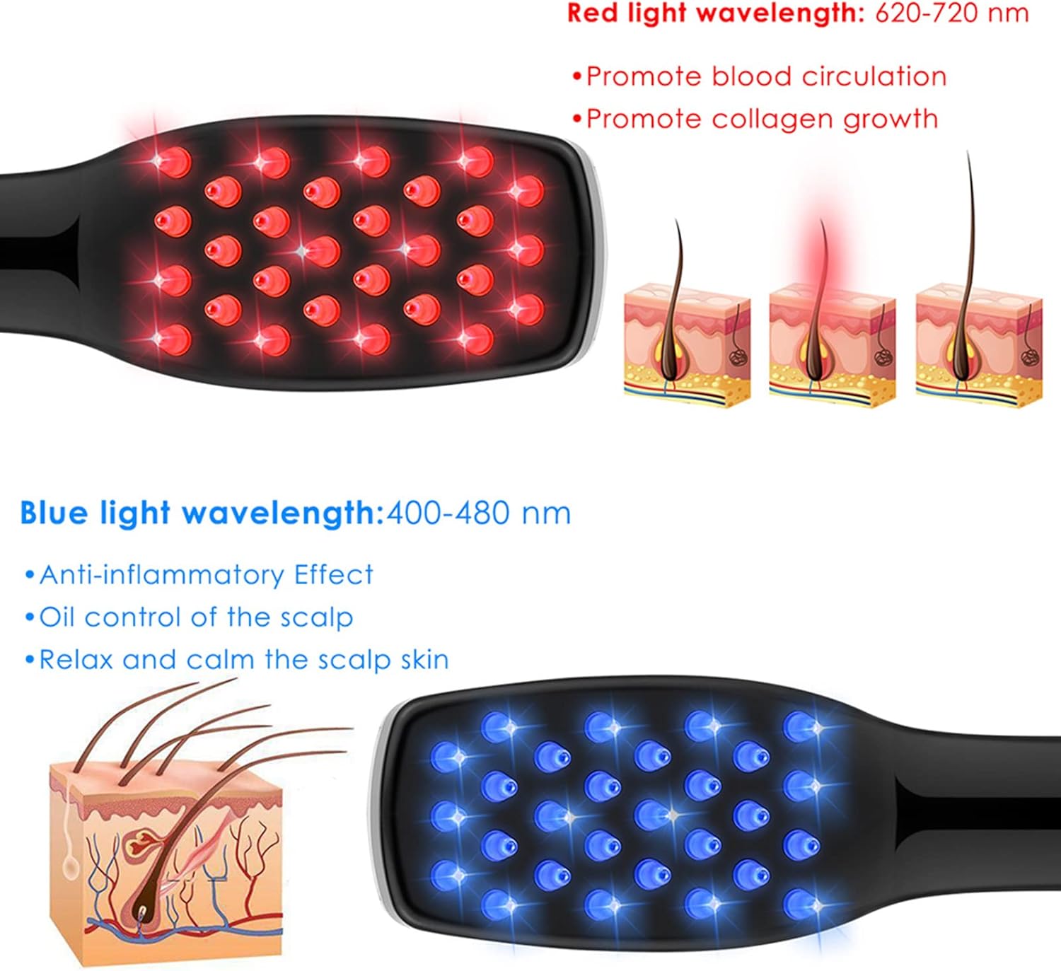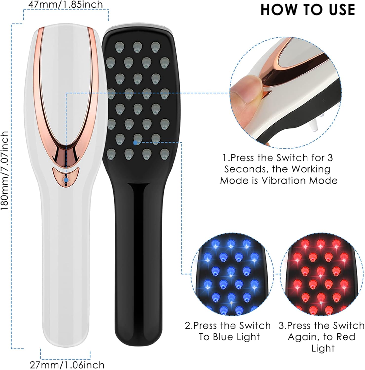 - 3 modos: modo de masaje por vibración, modo de vibración + luz roja, modo de vibración + luz azul para diferentes necesidades. Masajee el cuero cabelludo y la cabeza, nutra el cabello, mejore la circulación sanguínea y alivie el estrés con este cepillo para el cabello.
