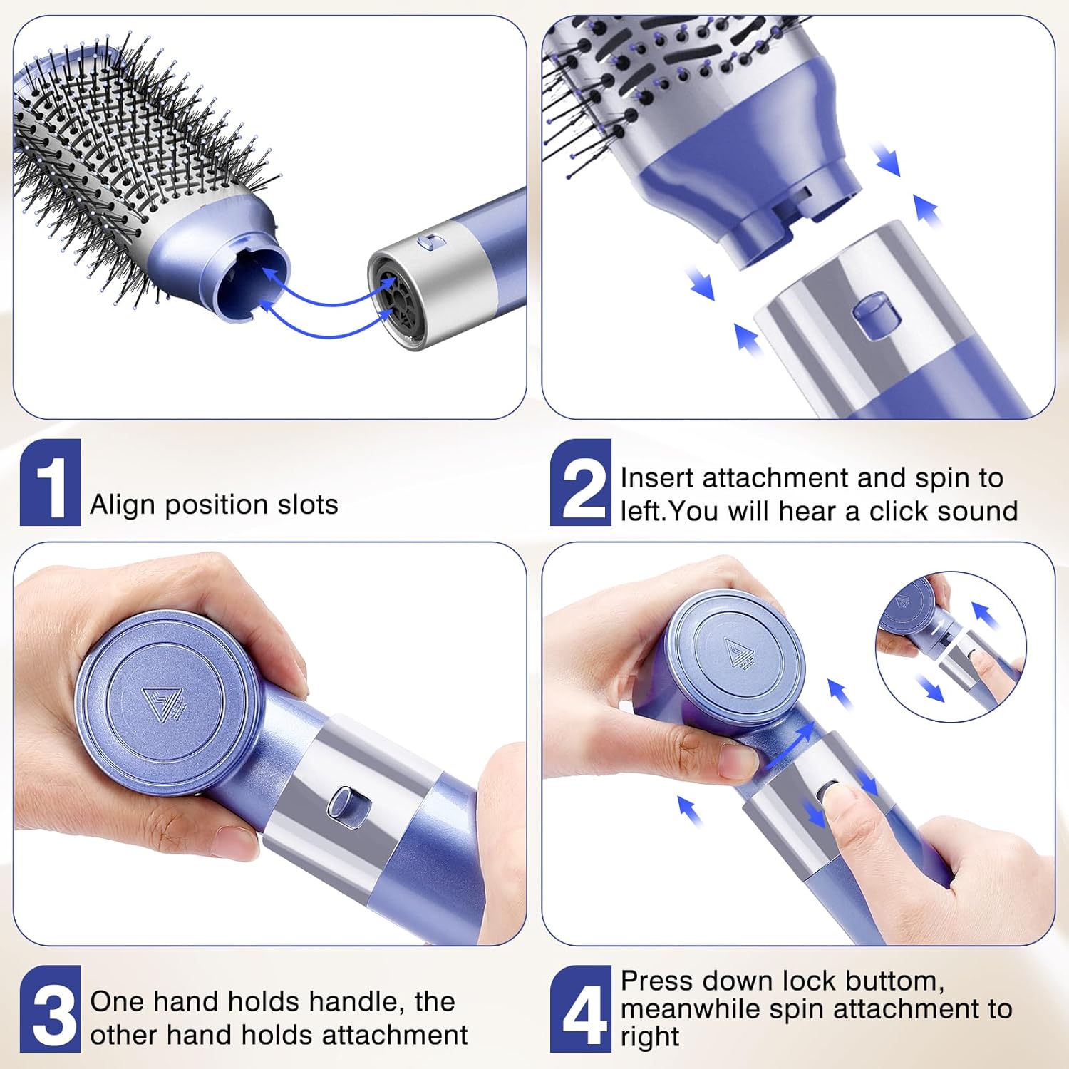 Diseño ergonómico: mango cilíndrico, tecnológico y texturizado, fácil de agarrar y fácil de almacenar. Revestimiento UV grueso en la superficie del mango, a prueba de arañazos, lo que también puede aumentar eficazmente la vida útil. El revestimiento de galvanoplastia de alta calidad hace que los botones de función sean más Pulsa durante mucho tiempo para encender y apagar el cepillo de secador de pelo. El diseño extraíble hace que reemplazar diferentes cabezales muy fácilmente. Y no tienes que preocuparte por la seguridad para el apagado automático después de media hora sin uso.