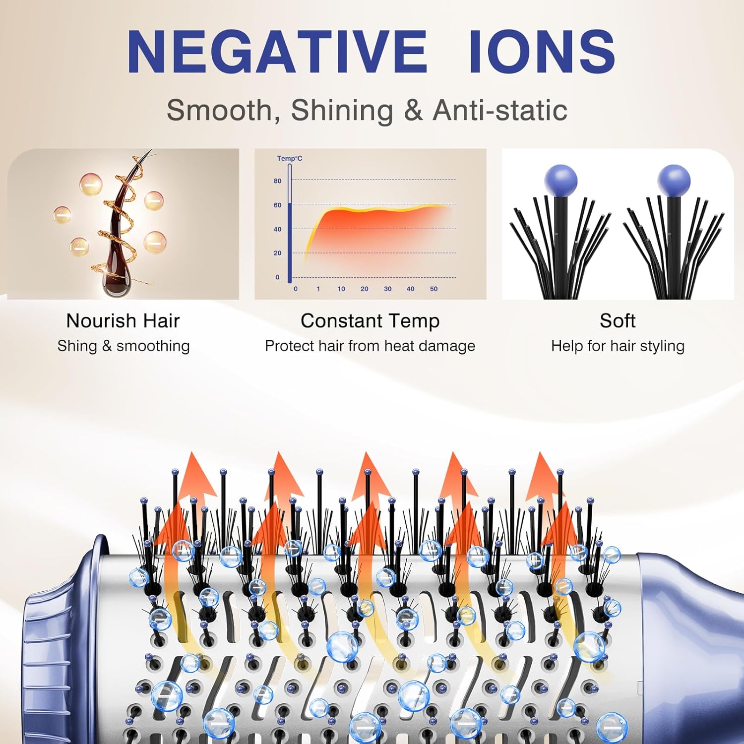 Motor sin escobillas de alta velocidad de 110,000 RPM; lo que hace que la potencia del cepillo redondo sea más eficiente, para un secado más rápido del cabello y 2 tamaños de cabezales de cepillo que suavizan el encrespamiento, lo que hace que el cabello sea más suave y brillante, y personaliza tus peinados exclusivos. El motor sin escobillas es más silencioso y menos ruido que el motor ordinario. Los iones negativos liberados bloquean rápidamente la humedad en el cabello, dejando tu cabello naturalmente brillante y sin encrespamiento, dándote un estilo elegante para cualquier ocasión.