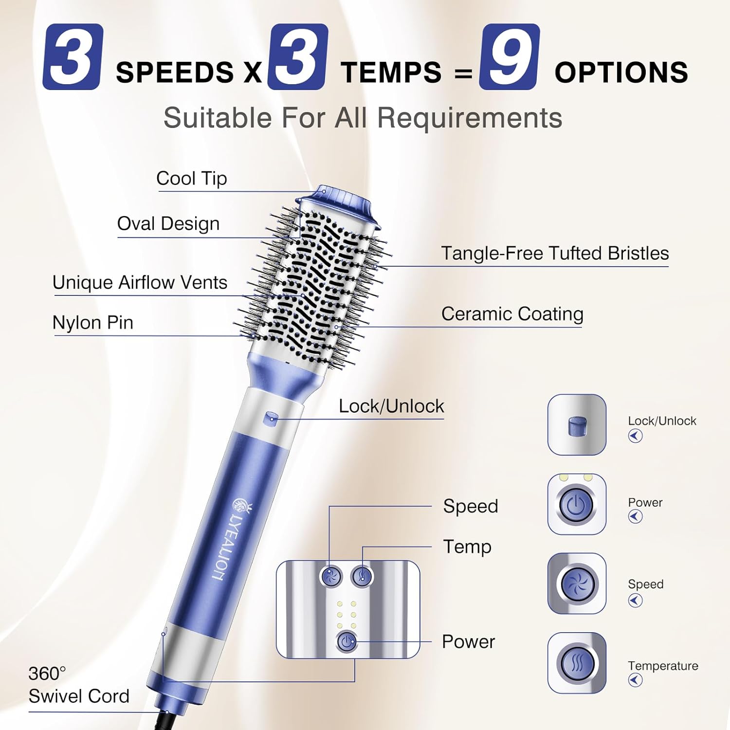 Crea estilos voluminizadores: 2 cabezas de 1.5 pulgadas, 2.5 pulgadas. La cabeza grande se adapta a cabello medio y largo, ayuda a suavizar, dar forma y dar volumen. La cabeza térmica pequeña se adapta a cabello corto, los hombres también pueden usar. Las cerdas densas y suaves están dispuestas firmemente y uniformemente, peinando tu cabello mientras forma la tensión superficial con él. Está envuelto en el peine de aire caliente de manera uniforme y se calienta uniformemente, mientras evita que se tire excesivamente. Y las cabezas calientes ovaladas hacen que las formas creadas no sean opacas, sino más naturales y esponjosas.