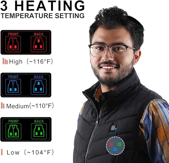 - Golpea el clima frío: el chaleco calefactado Genovega está especialmente construido con 5 paneles de zona de calor colocados alrededor de la espalda, el pecho y las manos para transferir calor en segundos. Tiene un cómodo diseño de control de temperatura de tres ajustes (alto, medio (110F), bajo (95F) y puerto USB de salida para proporcionar calor constante de acuerdo a tu deseo, además utiliza una batería de 10.000 mAh. Calienta hasta 5 Horas en la parte superior, 7 horas en el medio y 10 horas en la parte inferior.