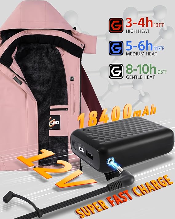 - Calor sin fin todo el día: potencia todo el día con confianza, gracias a la batería de larga duración de 16000 mAh 7.4 V que te mantiene caliente durante horas.
