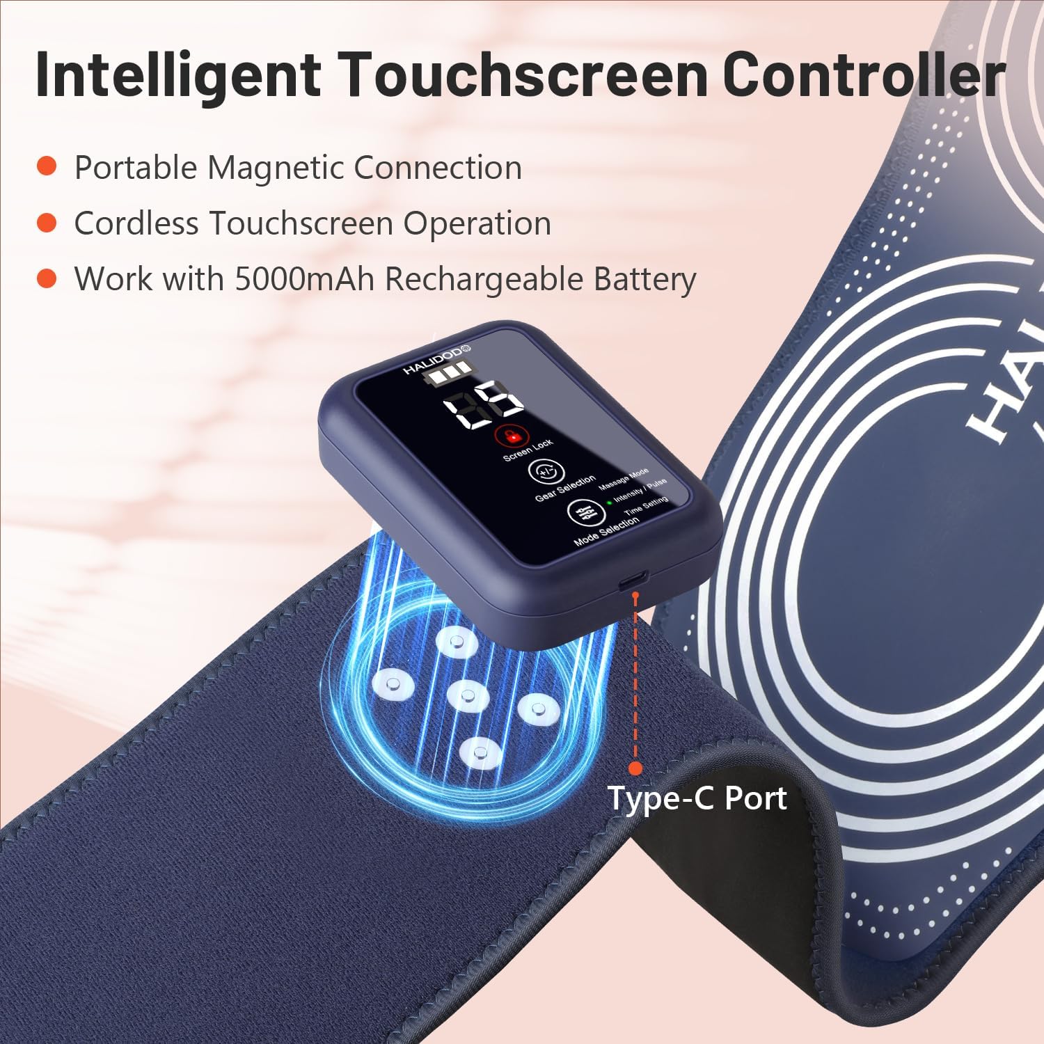 Controlador inalámbrico e inteligente: a diferencia de los cinturones de luz roja tradicionales, el controlador de alimentación del cinturón HALIDODO viene con una batería integrada de 5000 mAh, lo que te permite liberarte de las restricciones de los cables de alimentación. Diseño de batería de gran capacidad, con un tiempo de funcionamiento promedio de 1-2 horas después de cargar completamente el dispositivo. Diseño intuitivo de controlador de pantalla táctil, lo que te permite elegir libremente entre 6 modos de luz roja y 3 modos de masaje, por lo que es fácil personalizar tu tratamiento.