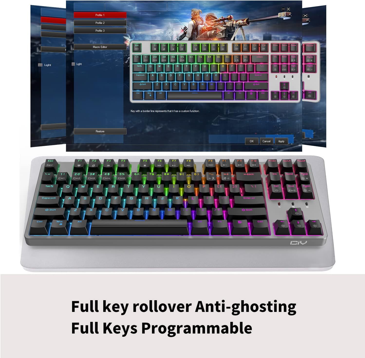 Soporte de software profesional: repara combinaciones de pulsaciones de teclas, asigna macros y personaliza el efecto de iluminación RGB con la potente unidad CIY. El teclado es compatible con los sistemas Win7, Win8, Win10, iOS y Mac.