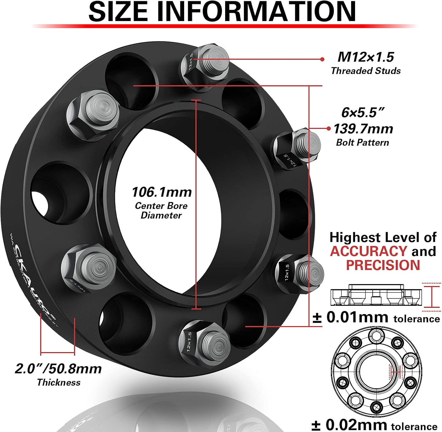 - Especificaciones de los espaciadores de rueda: patrón de pernos de vehículo de 6 x 5.5 pulgadas (0.236 x 5.500 in) / grosor de 2.0 pulgadas / orificio del cubo de 4.177 in / paso de rosca M12x1.5 / Longitud efectiva del perno de 0.984 in, el procesamiento automático CNC hace que el error se controle dentro de 0.001 in.
