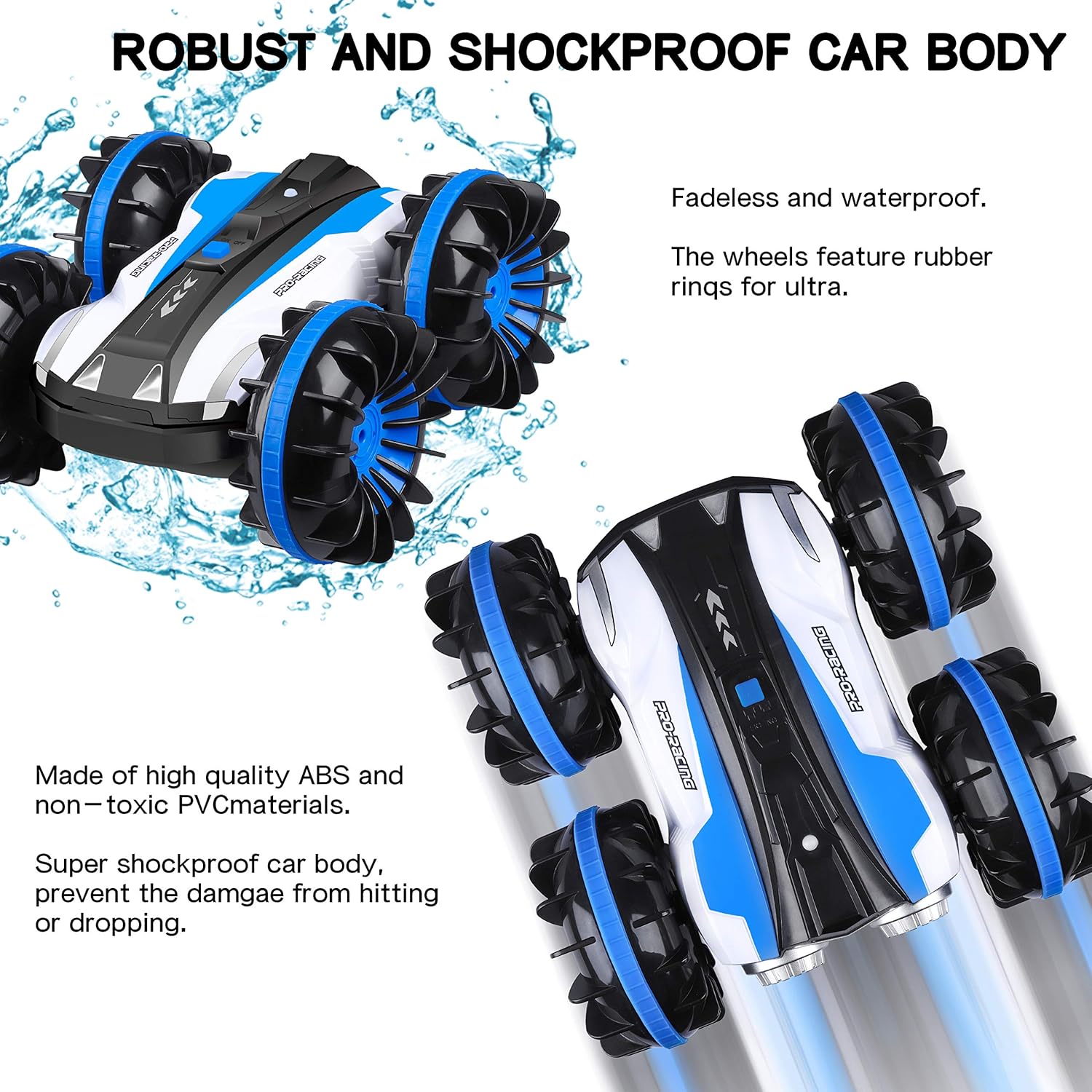- Coche resistente al agua: el coche con mando a distancia puede correr por dos lados, giro de 180 grados y rotación de 360 grados. El diseño de monstruo todoterreno lo apoya a romper a través de la tierra, playa de arena, barro, hierba o mar fácilmente. Función y uso: con los 7 modos funcionales: hacia adelante, hacia atrás, girar a la izquierda, girar a la derecha, rotación de 360°, 180° de doble cara, presentación automática.