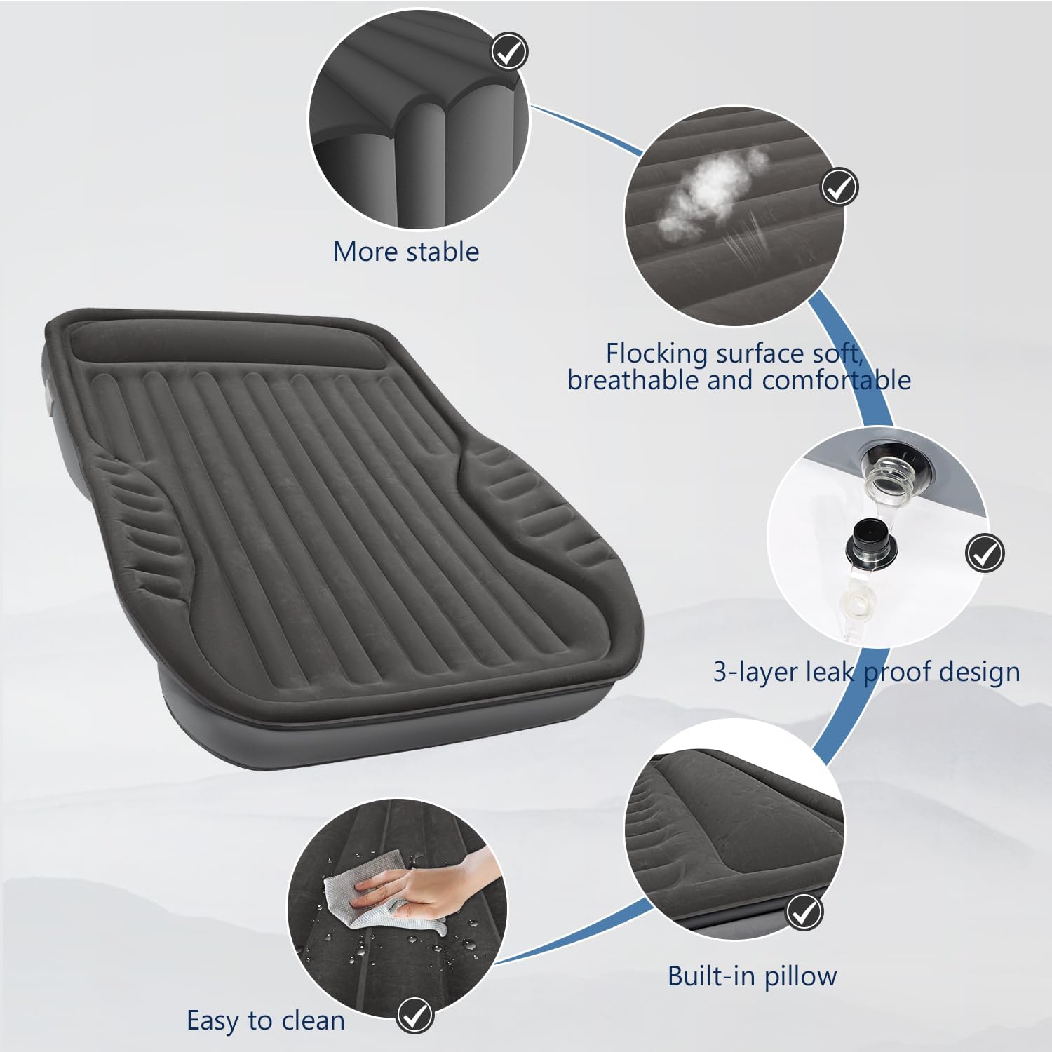 - Colchón de aire multifuncional: con un diseño autoinflable, el colchón para automóvil es fácil de empacar y desplegar. Ya sea en tu SUV, RV, camión, o instalado en tu sala de estar o en un campamento, este colchón de aire se adapta perfectamente a tus necesidades.