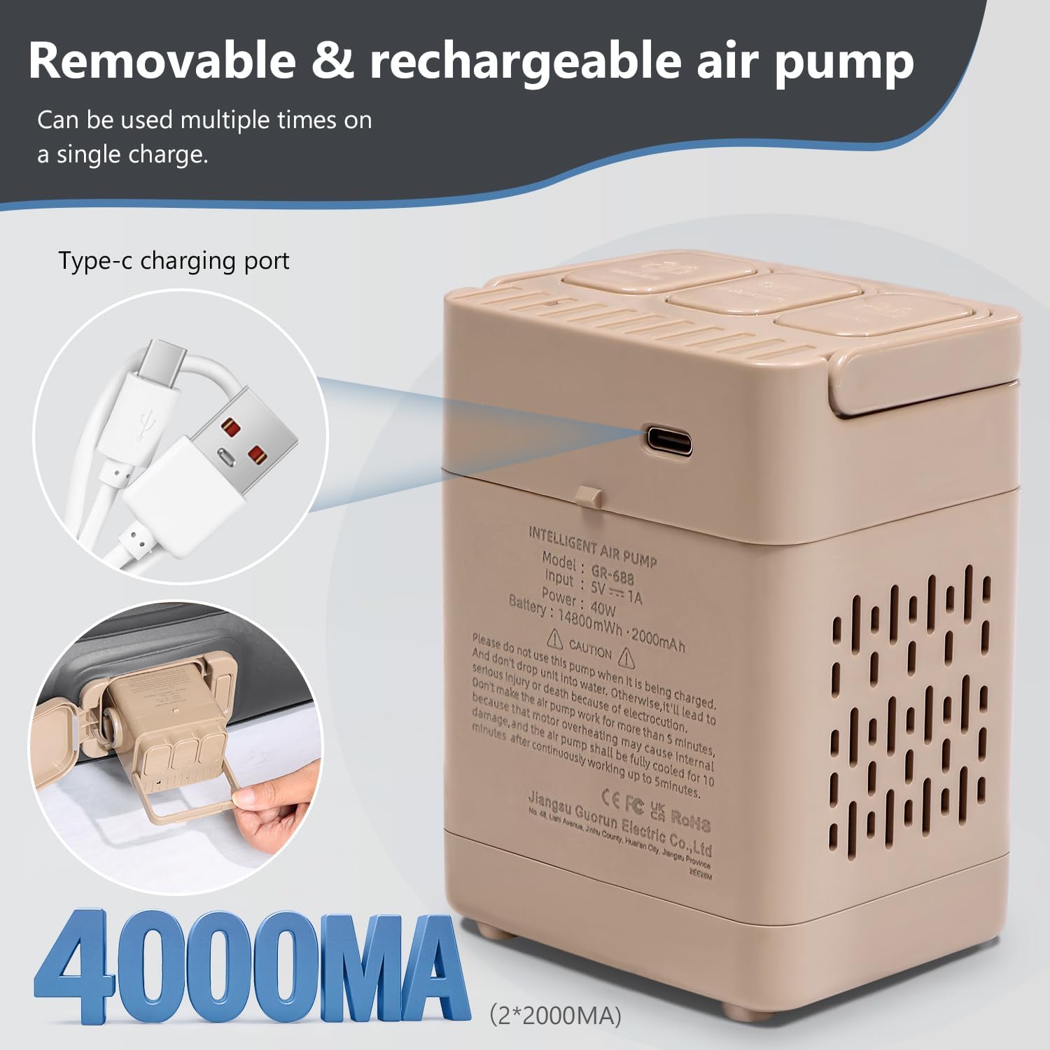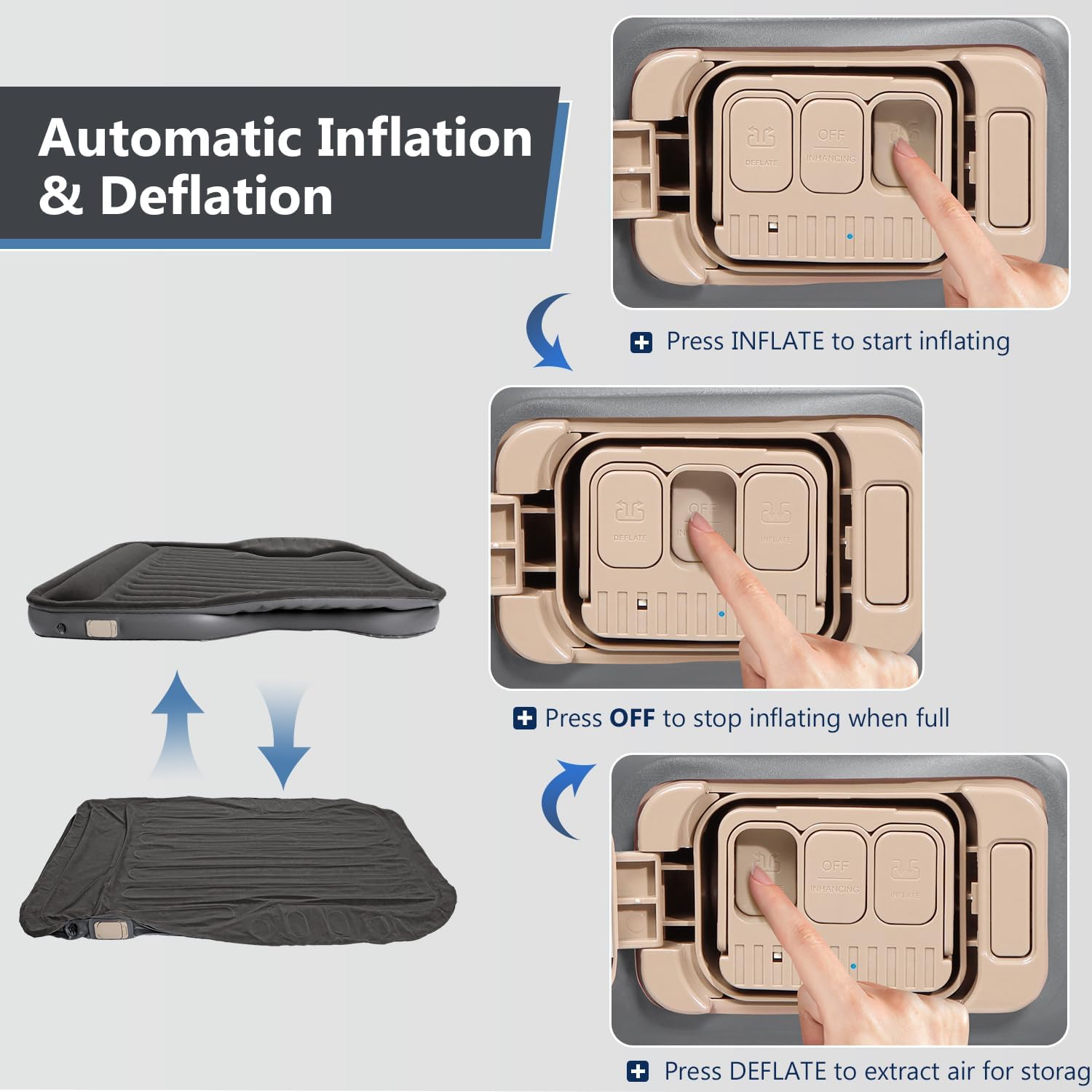 - Fácil, rápido y sin complicaciones: este colchón de campamento para automóvil cuenta con una bomba extraíble integrada mejorada. Con una sola pulsación, logra un inflado rápido en solo 2 minutos. Una vez completamente cargado, se puede inflar hasta 8 veces.