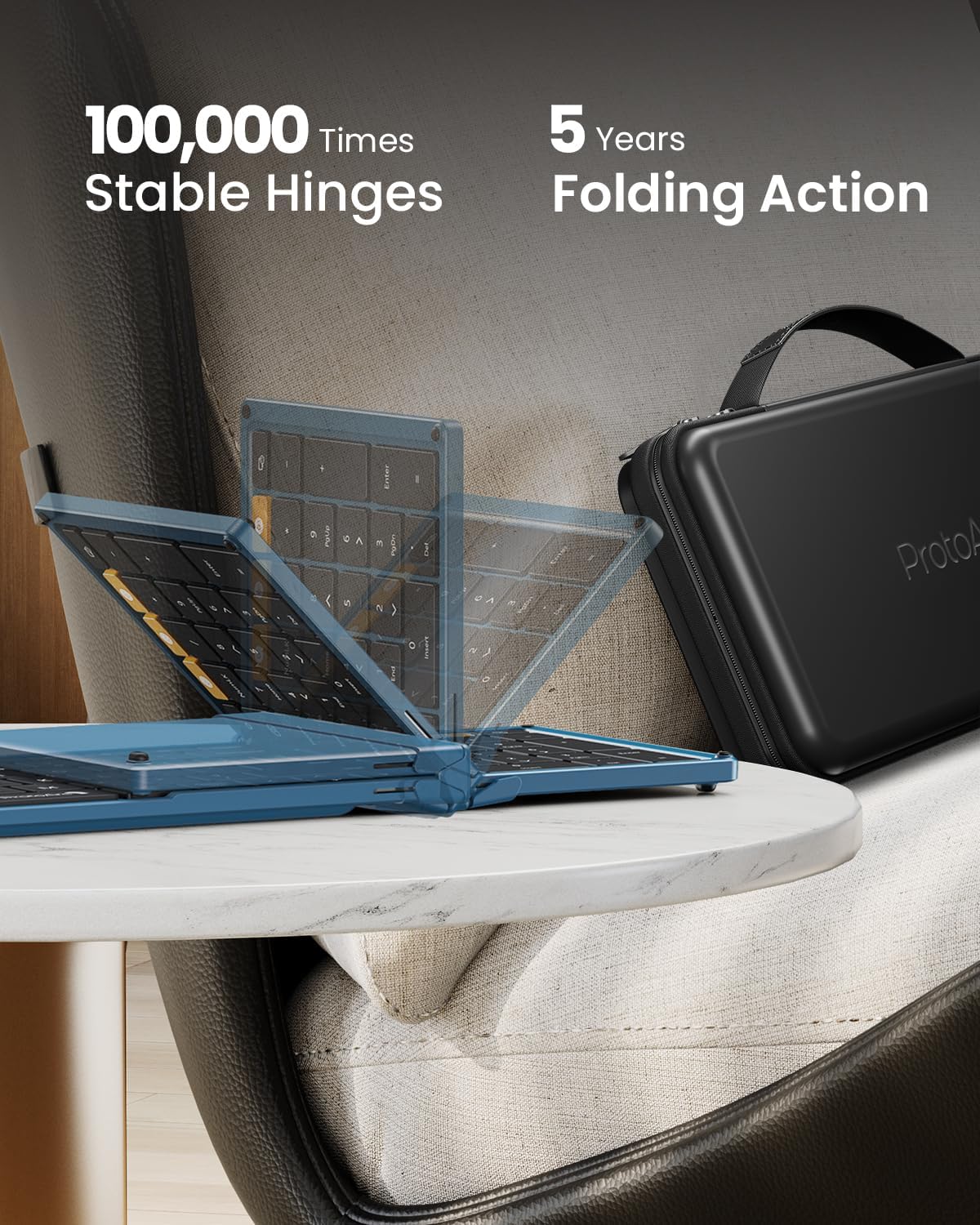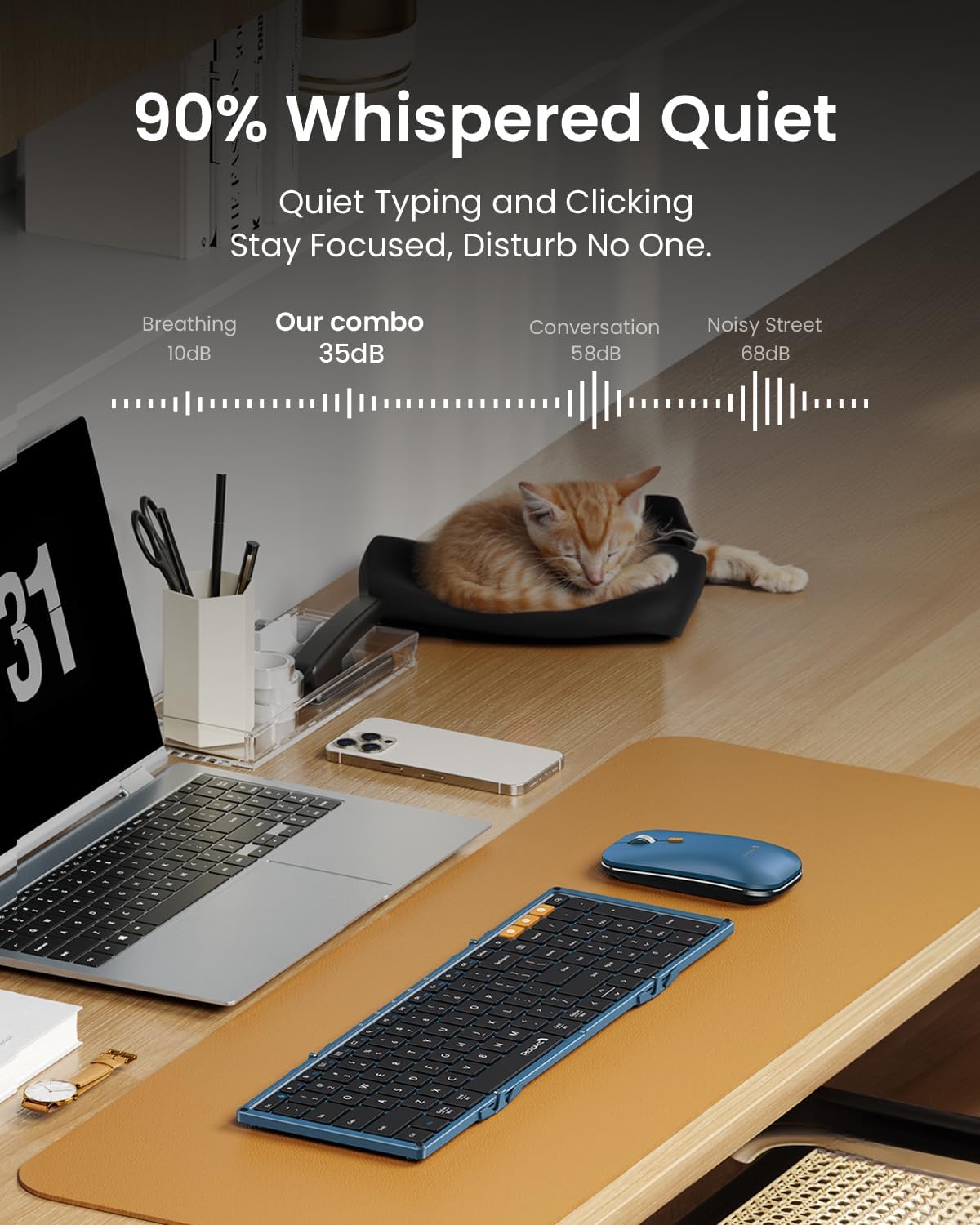 - Trabaja en silencio en cualquier lugar: nuestro teclado Bluetooth plegable cuenta con interruptores de tijera silenciosos y teclas de perfil bajo, junto con un mouse que reduce el ruido para ofrecer silencio a nivel de biblioteca. Perfecto para reuniones, cafeterías y vuelos, mejora el enfoque en un 50% sin molestar a los demás