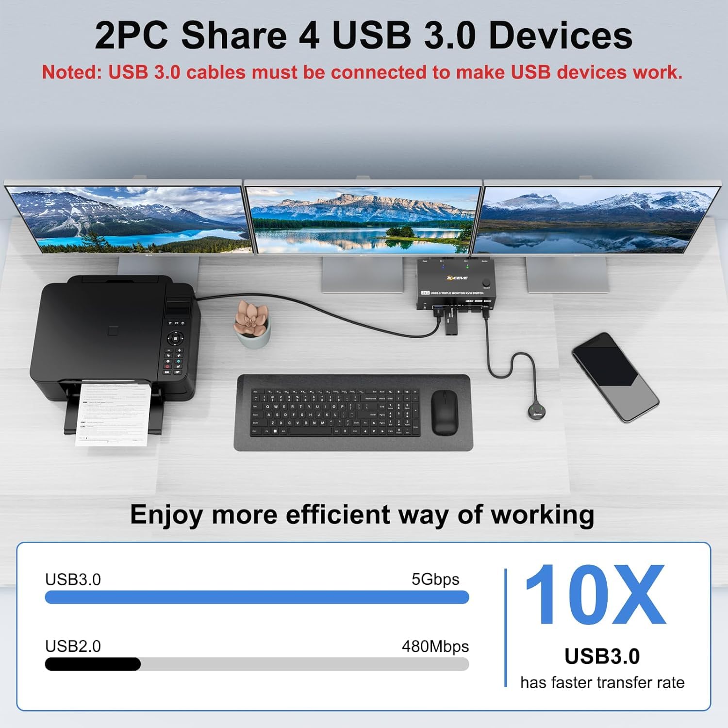 - Conmutador KVM 3 monitores 2 computadoras: los interruptores KVM permiten que 2 computadoras compartan 3 monitores y 4 dispositivos USB3.0. Compatible con modo de visualización extendido y copiado. Modo ampliado: los ordenadores alojan en salida 3 imágenes diferentes en 3 monitores. Modo de copia: el host del computadora emite 3 imágenes idénticas en 3 monitores.