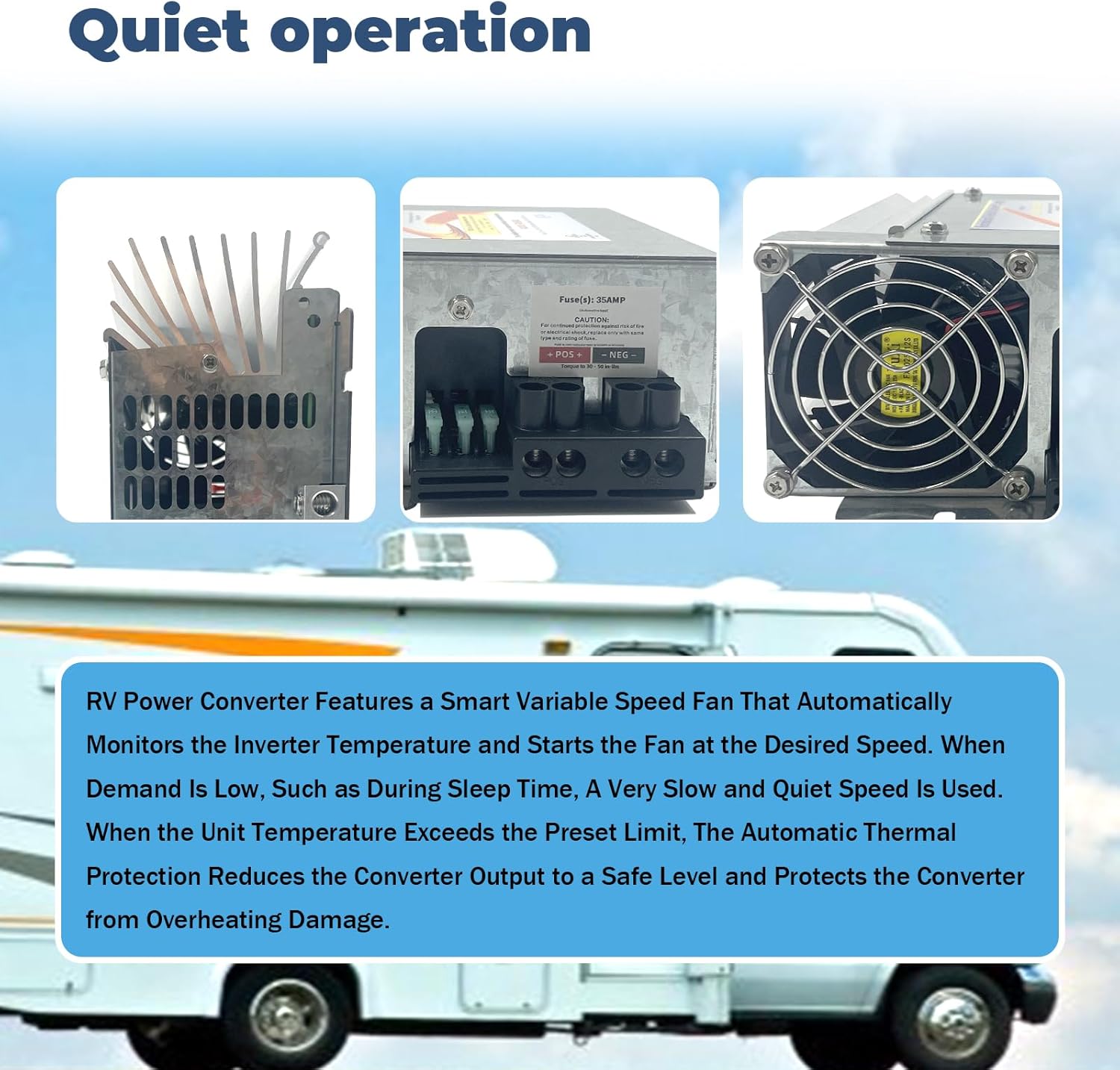 - Silencioso y eficiente: el convertidor de potencia RV cuenta con un ventilador inteligente de velocidad variable que monitorea automáticamente la temperatura del inversor y arranca el ventilador a la velocidad deseada. Cuando la demanda es baja, como durante el tiempo de sueño, se utiliza una velocidad muy lenta y silenciosa. Cuando la temperatura de la unidad supera el límite preestablecido, la protección térmica automática reduce la salida del convertidor a un nivel seguro y protege el convertidor de daños por sobrecalentamiento.