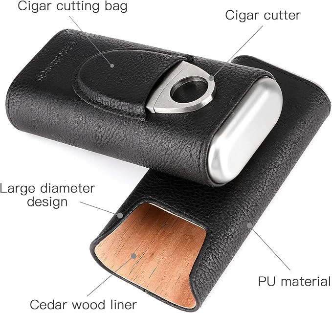 - Accesorios para puros: nuestra funda portátil para puros está equipada con un cortador de puros, hecho de acero inoxidable 420. Es muy duradero. Cuando no esté en uso, puedes poner el cuchillo en el bolsillo frontal del humidificador de puros.