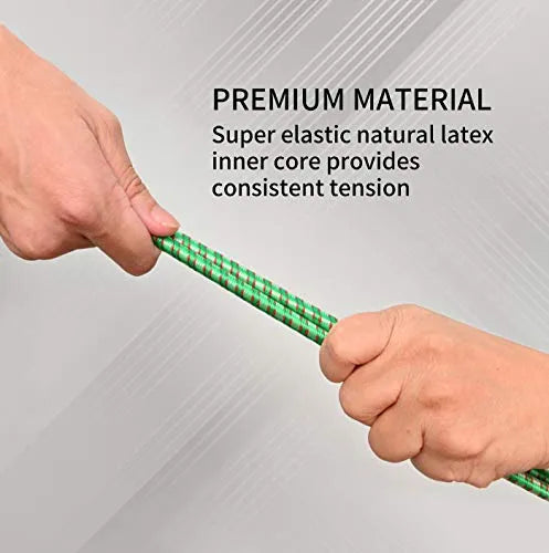 - Las cuerdas elásticas están convenientemente codificadas por colores por longitud, coloridas en varios tamaños, que incluyen 4 piezas de 10 pulgadas, 2 piezas de 18 pulgadas, 4 piezas de 24 pulgadas, 4 piezas de 30 pulgadas, 4 piezas de 36 pulgadas, 2 piezas de 48 pulgadas.