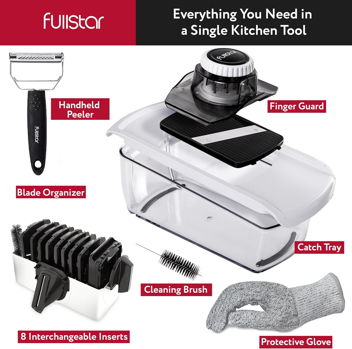 - La mayor funcionalidad del mercado: 7 cuchillas intercambiables y un pelador de mano para satisfacer todas tus necesidades de rebanar y rallar, mientras que nuestros espiralizadores son perfectos para zoodles, pastas vegetales saludables y hermosas guarniciones.