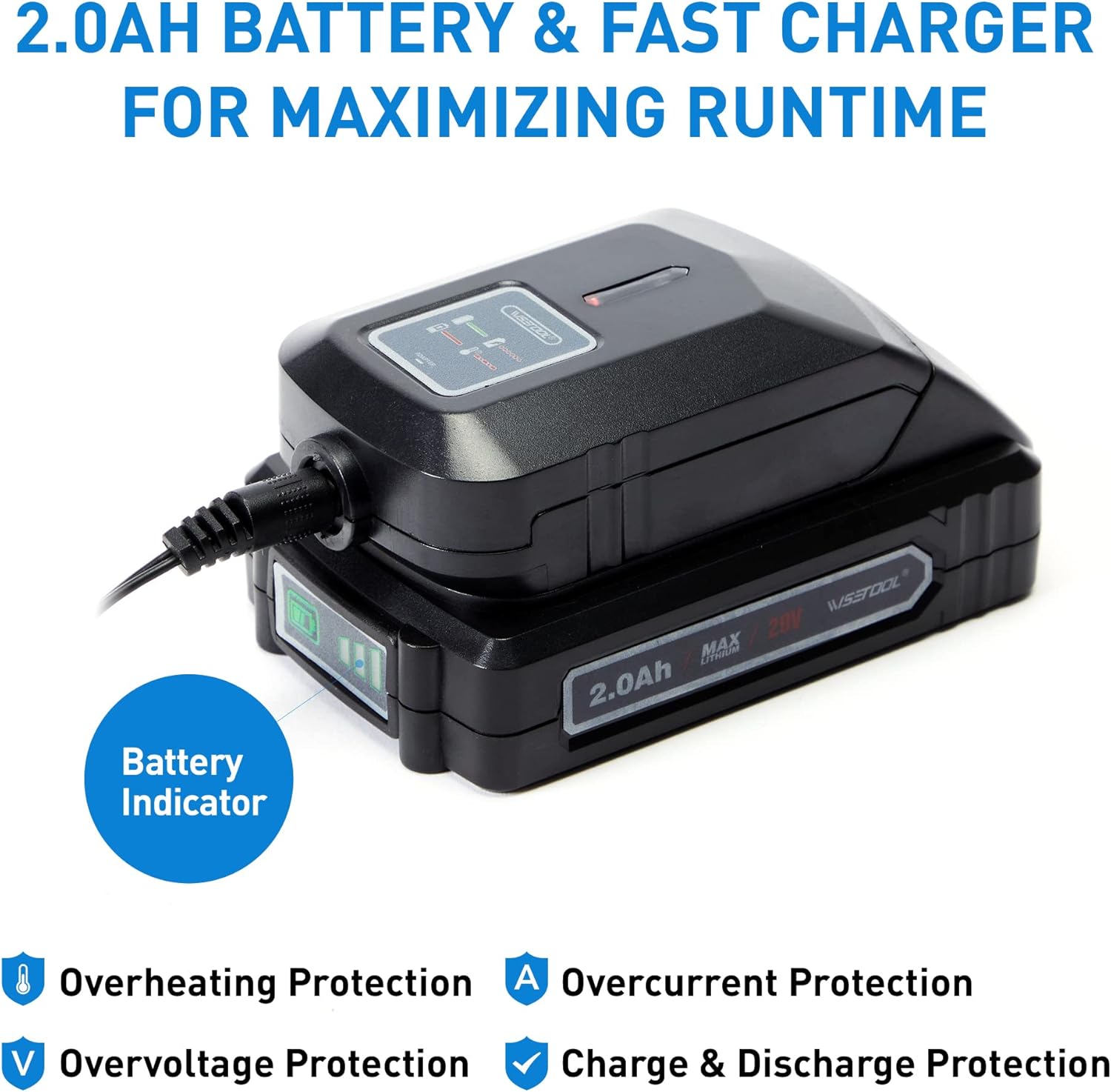 - Cargador rápido y batería de 2.0 Ah: Proporcionaremos un conjunto completo de equipos de trabajo, no necesitas una compra adicional. Una carga completa solo tarda 1 hora utilizando el cargador rápido que proporcionamos. La batería también se aplica a otras herramientas inalámbricas WISETOOL.
