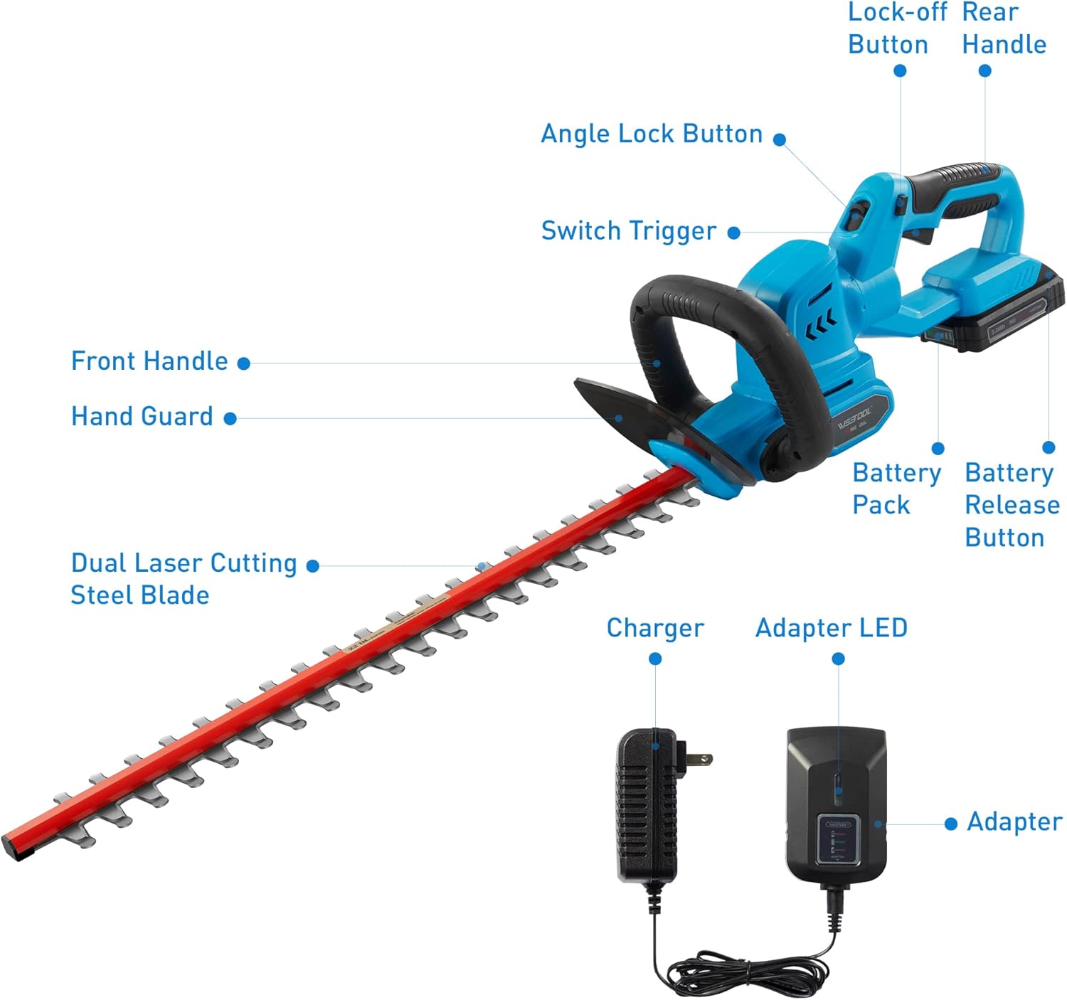 - Cuchillas de doble acción: cuchillas de doble acción de 22 pulgadas para garantizar menos vibración y bajo ruido que las cuchillas de una sola acción mientras recortas, diámetro de corte de hasta 3/4 pulgadas, perfecto para setos, arbustos y arbustos