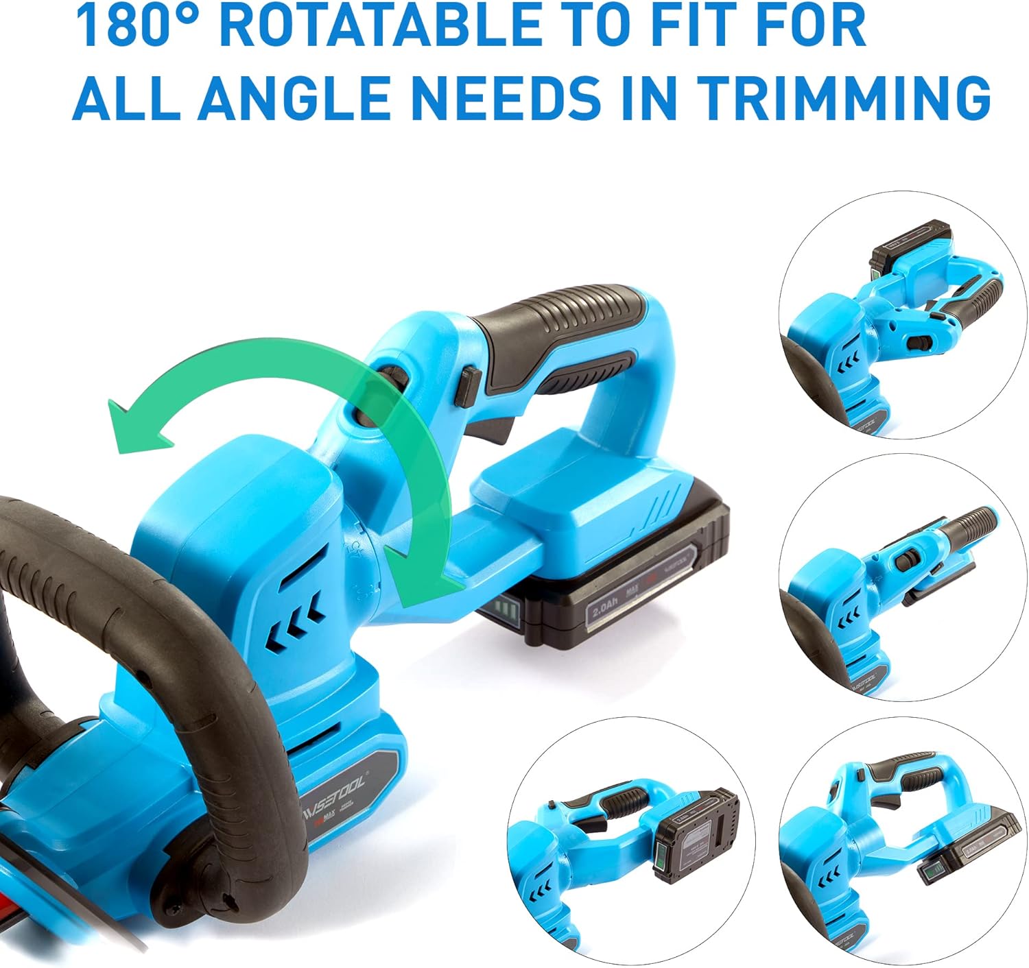- Mango giratorio y antideslizante de 180°: el diseño de mango giratorio de 180° proporciona más control y compensa la mayor parte de la vibración durante el uso. Por supuesto, puede ayudarte a recortar desde cualquier ángulo. El mango de goma suave puede evitar resbalones y te da un manejo cómodo