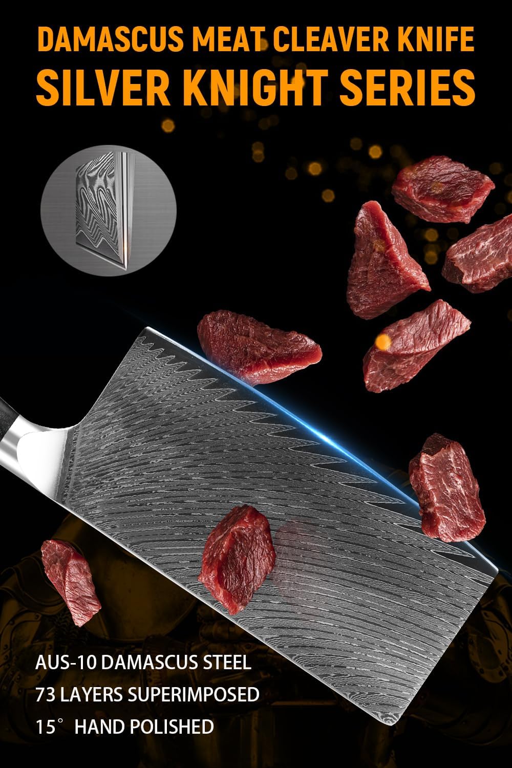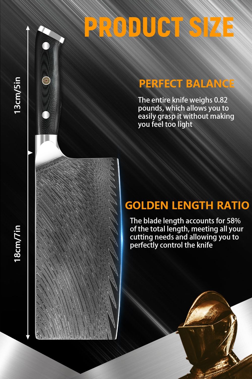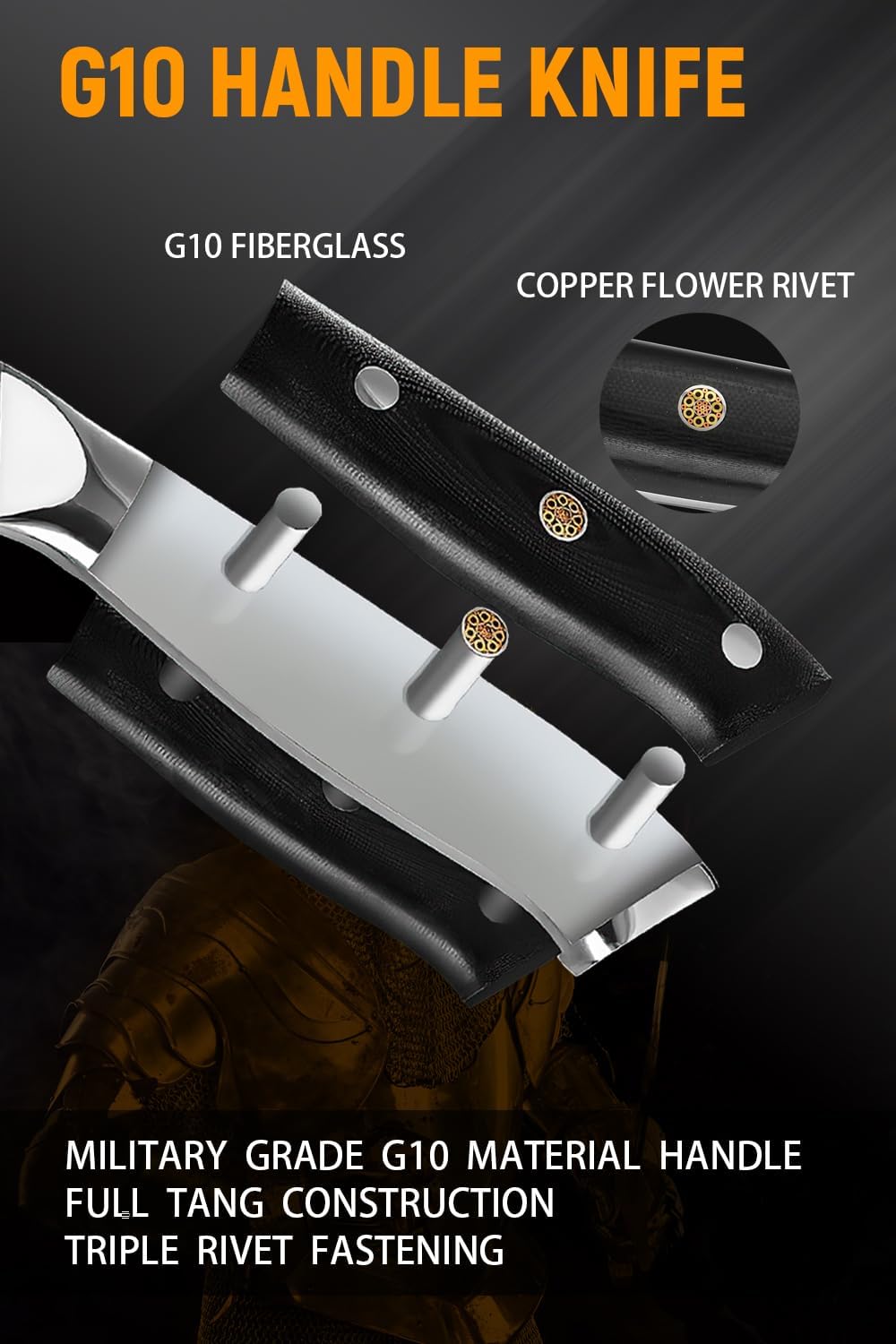- Cuchilla de acero AUS 10 - Carne Cleaver está hecha de acero inoxidable de alto carbono, ofreciendo una dureza de 60 ± 2 HRC. Con cromo, manganeso y otros elementos, garantiza una excelente resistencia a la corrosión y una nitidez duradera.