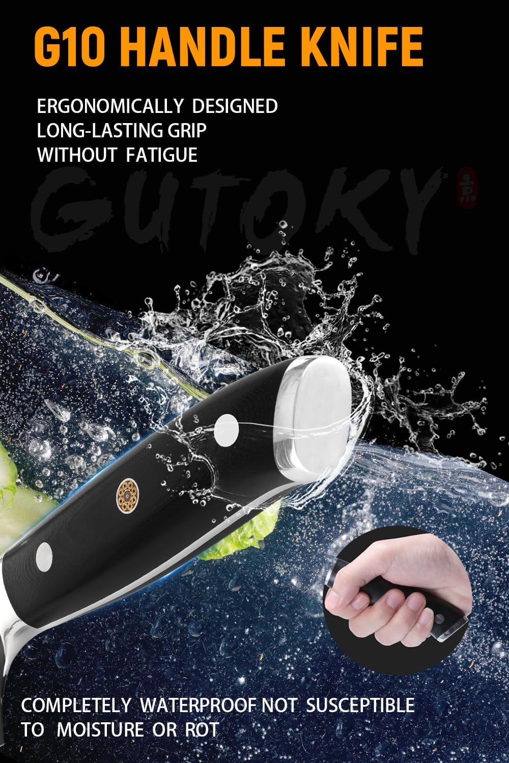 - Mango G10: el mango se ve favorecido por su dureza y resistencia a la humedad, por lo que es más duradero que la madera o el plástico. Proporciona un agarre seguro y antideslizante, y su diseño elegante añade elegancia a este cuchillo de alta gama