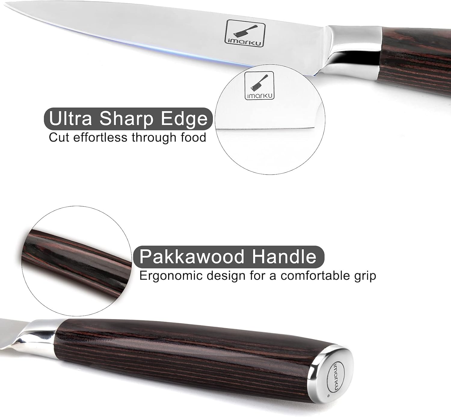 - Mango ergonómico Pakkawood: para minimizar la fatiga, entumecimiento de los dedos o dolor cuando se mantiene continuamente durante mucho tiempo, el mango del cuchillo de pelar del cuchillo está hecho por Pakkawood. Este es un material originario de África, conocido por su comodidad, resistencia y estabilidad. (No utilizar lavaplatos para limpiar)