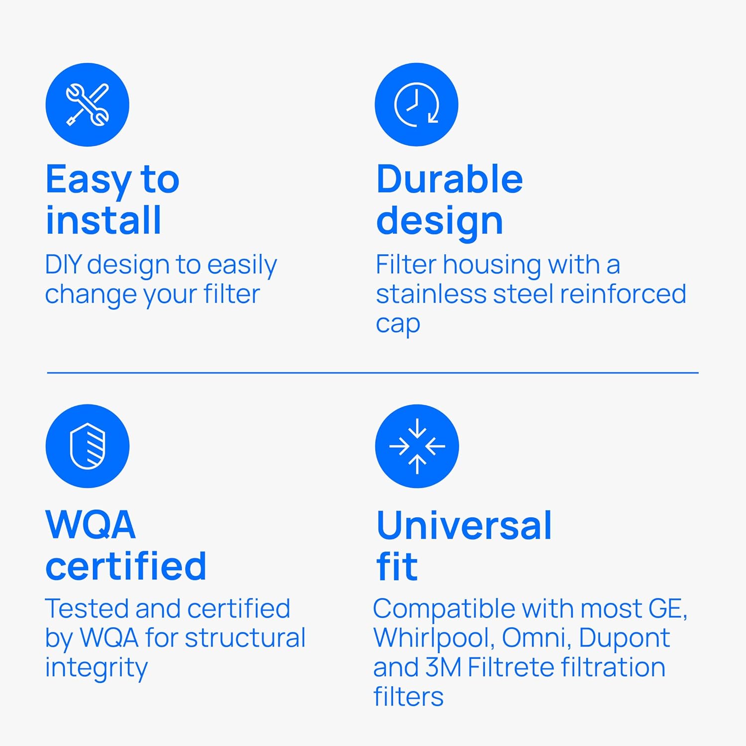 - Sistema de filtración de agua para toda la casa con conectores de entrada/salida reforzados de acero inoxidable de 1"