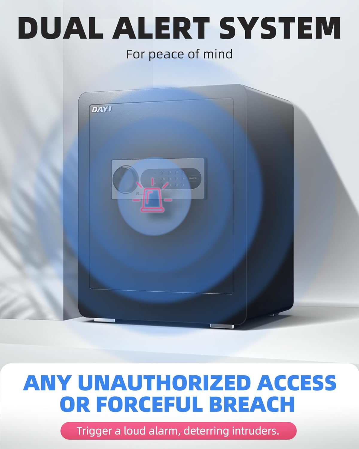 - Sistema de alerta doble para tranquilidad: con un sistema de advertencia de alarma doble, la caja fuerte DAYI para el hogar garantiza que tus pertenencias estén protegidas. Tres intentos de contraseña incorrectos o cualquier forzosa desencadenan una alarma fuerte de 70 decibelios, disuadir a los intrusos.