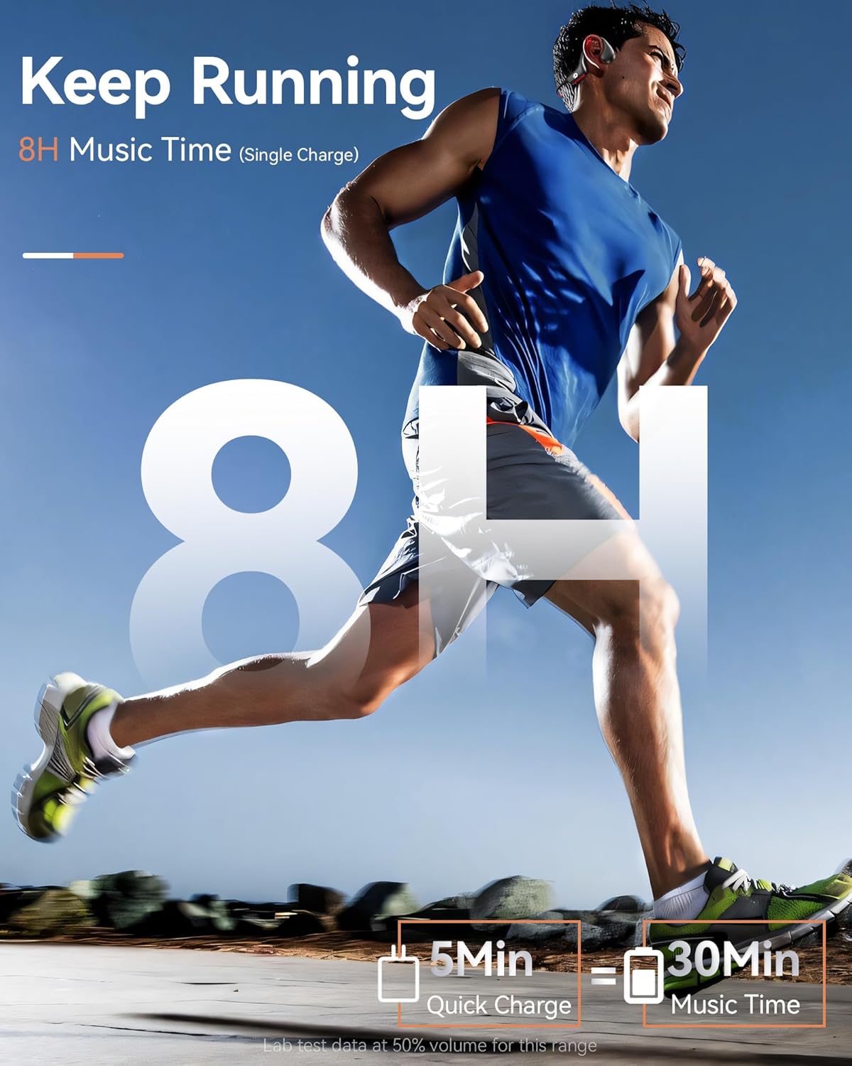 - Estos auriculares deportivos de oreja abierta te permiten disfrutar de sesiones de música prolongadas. Solo 2 horas de carga proporciona hasta 8 horas de música, atendiendo a tus largas sesiones de entrenamiento. Además, una carga rápida de 5 minutos ofrece media hora de reproducción, lo que garantiza que puedas volver rápidamente a la ranura después de breves descansos.
