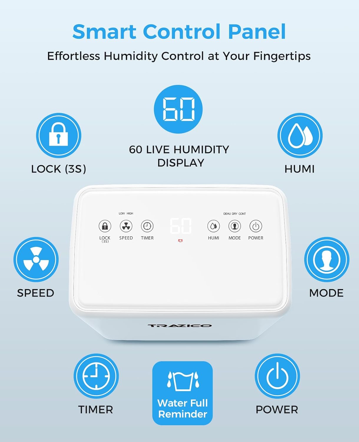 - Control táctil inteligente para una humedad perfecta: nuestros deshumidificadores cuentan con un sistema de control de pantalla táctil intuitivo, por lo que es fácil ajustar los ajustes y personalizar tu experiencia de deshumidificación. Puedes ajustar sin esfuerzo el temporizador de 24 horas, detectará de forma inteligente la humedad de la habitación para mantener los niveles preestablecidos y reducir el consumo de energía. Además, la cerradura para niños evita la operación accidental por niños o mascotas, asegurando un uso sin preocupaciones en espacios familiares como dormitorios, salas de estar