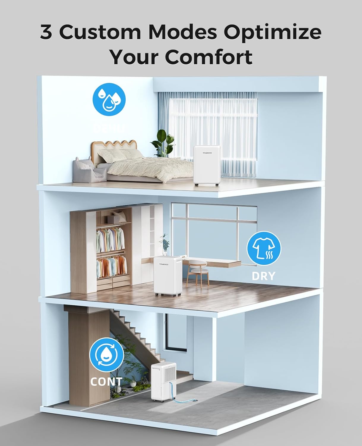 - 3 modos inteligentes para cada necesidad: los deshumidificadores de alto rendimiento tienen 3 modos de deshumidificación. El modo DEHU ajusta la humedad del 30% al 80% con 2 velocidades de ventilador para adaptarse perfectamente a las condiciones de tu habitación, el modo Dry seca rápidamente la ropa húmeda, ideal para estaciones lluviosas, el modo CONT funciona sin parar hasta alcanzar la humedad objetivo, lo mejor para sótanos y zonas de alta humedad. (Consejos: mantenga las ventanas y puertas cerradas durante la operación para maximizar la eficiencia de deshumidificación).