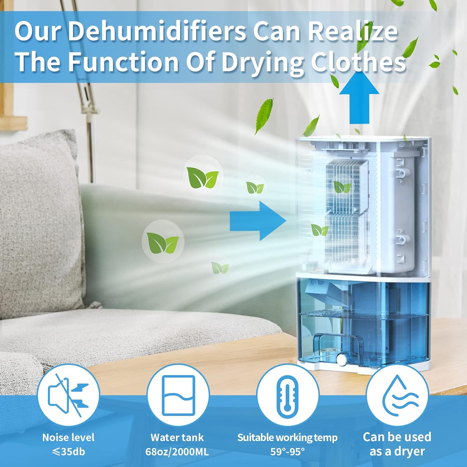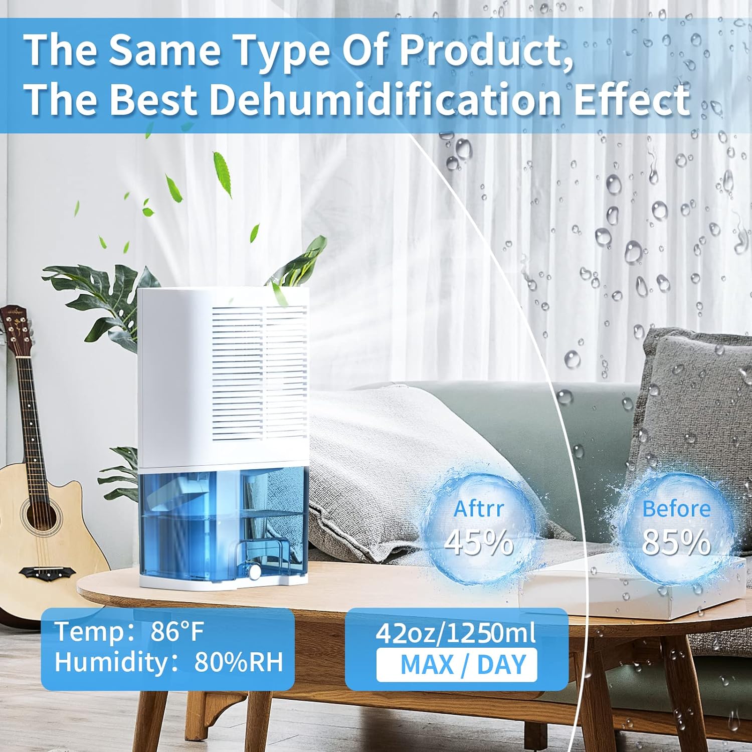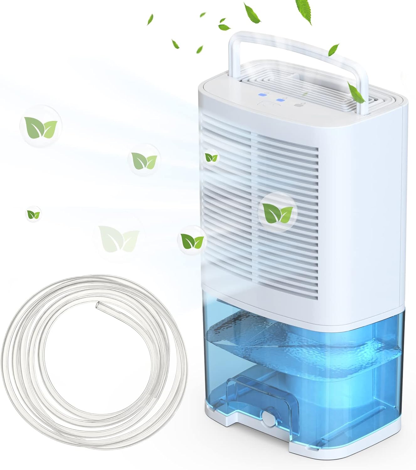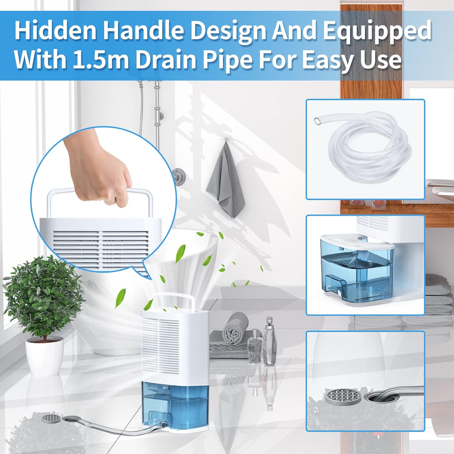 - Deshumidificador con manguera de drenaje: el deshumidificador mejorado adopta la tecnología Peltier y semiconductores de enfriamiento dobles para condensar moléculas de agua húmeda en gotas de agua, puede recoger eficazmente hasta 34 onzas (33.8 fl oz) de agua diariamente en un ambiente húmedo de 86 °F y 80 % de RH. Potente deshumidificación: reduce la humedad y la mantiene por debajo del 45%.