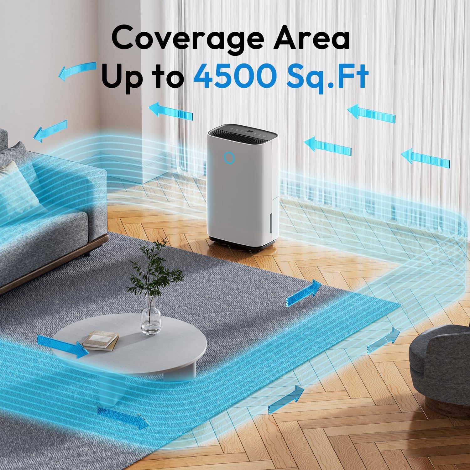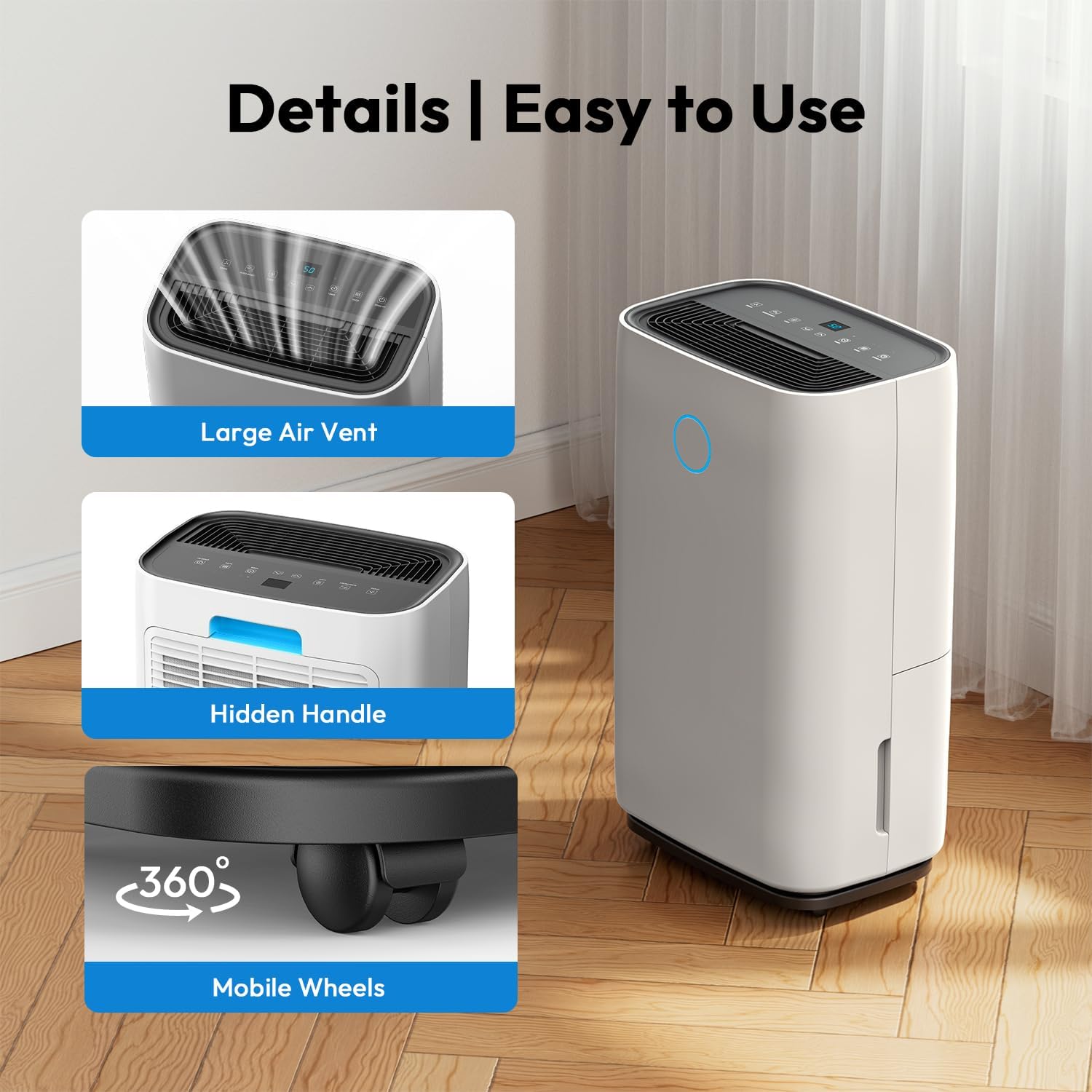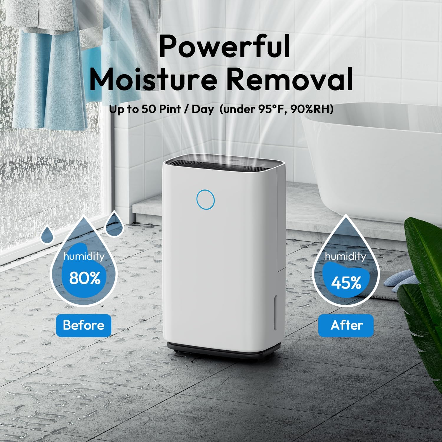 Deshumidificador de sótano de 4500 pies cuadrados, deshumidificador doméstico de 50 pintas con manguera de drenaje, modo de suspensión silenciosa, apagado automático, indicador de humedad y descongelación automática.